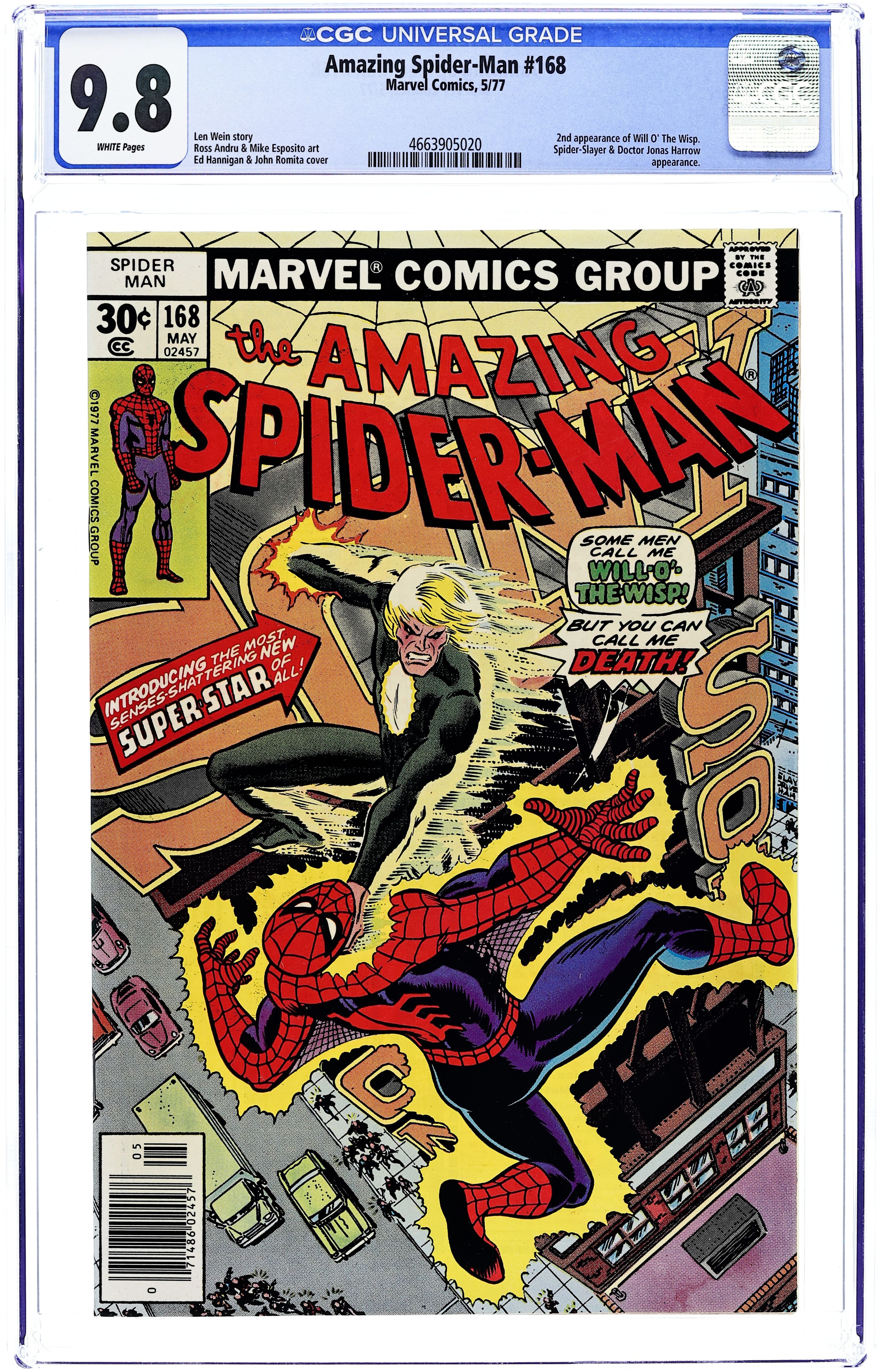 "Stalked by the Spider-Slayer!" Part 1 of 2. First appearance of Will-O'-the-Wisp. Script by Len Wein. Art by Ross Andru (breakdowns) and Mike Esposito (finishes). Cover by John Romita. With Dr. Marla Madison's new and improved spider-slayer, J. Jonah Jameson takes another run at capturing the wondrous wall-crawler! But in typical fashion, JJJ stumbles and bumbles in his attempt to subdue Spidey! In the meantime though, a new villain has come to New York City: Will-O'-the-Wisp! And the Wisp has unearthly electromagnetic powers! The spider-slayer is just the undercard for the amazing one! Will-O'-the-Wisp is the main event! First appearance of Dr. Bart Hamilton (aka the third Green Goblin). Cameo appearances by Aunt May, Anna Watson, Harry Osborn, Liz Allan, Flash Thompson, and Mary Jane Watson. (Note: The letters page includes a statement of ownership: average print run 555,709; average paid circulation 282,159.) 36 pages. Cover price $0.30.