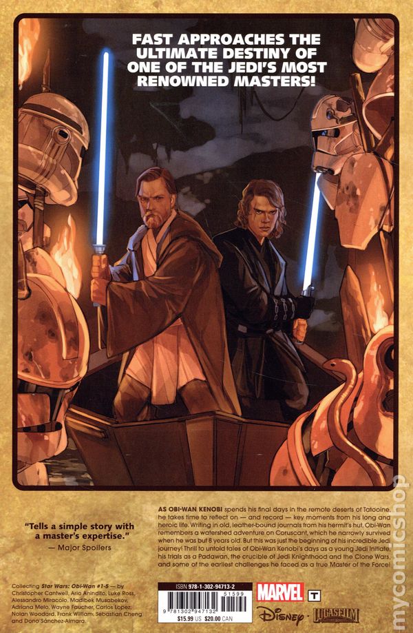 1st printing. Collects Star Wars: Obi-Wan Kenobi (2023 Marvel) #1-6. Written by Jody Houser. Art by Salvador Larroca. Cover by Phil Noto. Obi-Wan returns in the official adaptation of the hit series! When agents of the Empire pose a new threat, Obi-Wan Kenobi emerges after years of hiding. Years after the events of Revenge of the Sith, Obi-Wan is tasked with keeping both of the Skywalker children safe from a distance - until young Leia Organa finds herself held in a ransom plot! Can Obi-Wan save Princess Leia without the Empire realizing he's alive? As he searches for allies, he must face his greatest failure: Darth Vader! Softcover, 200 pages, full color. Rated T Cover price $29.99.