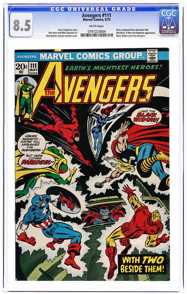 "With Two Beside Them!" Part 3 of 3. Guest-starring the Black Widow, Daredevil, and the X-Men. Script by Steve Englehart. Pencils by Don Heck. Inks by Mike Esposito. Cover by John Romita and Joe Sinnott. Story continues from Daredevil 99 (part 2). Magneto stands triumphant! The X-Men's long-time foe and his lackey, the Piper, have taken Captain America, Iron Man, and the Scarlet Witch prisoner along with Professor X, Cyclops, Marvel Girl, and Iceman! And now the Master of Magnetism is planning to raid a top secret meeting of the Atomic Energy Commission! However, since their defeat last issue, the remaining avengers have been busy recruiting superhero help! Namely Daredevil and the Black Widow! When Earth's Mightiest Heroes at last locate Magneto's underground lair, the super showdown begins! Will the Avengers finally repulse the Master of Magnetism? Cameo appearance by Hawkeye. Flashback cameos by Angel, Quicksilver, Mastermind, and the Toad. (Notes: Magneto appears next in Defenders 15. The Avengers battle Magneto again in Super-Villain Team-Up 14.) 36 pages Cover price $0.20.