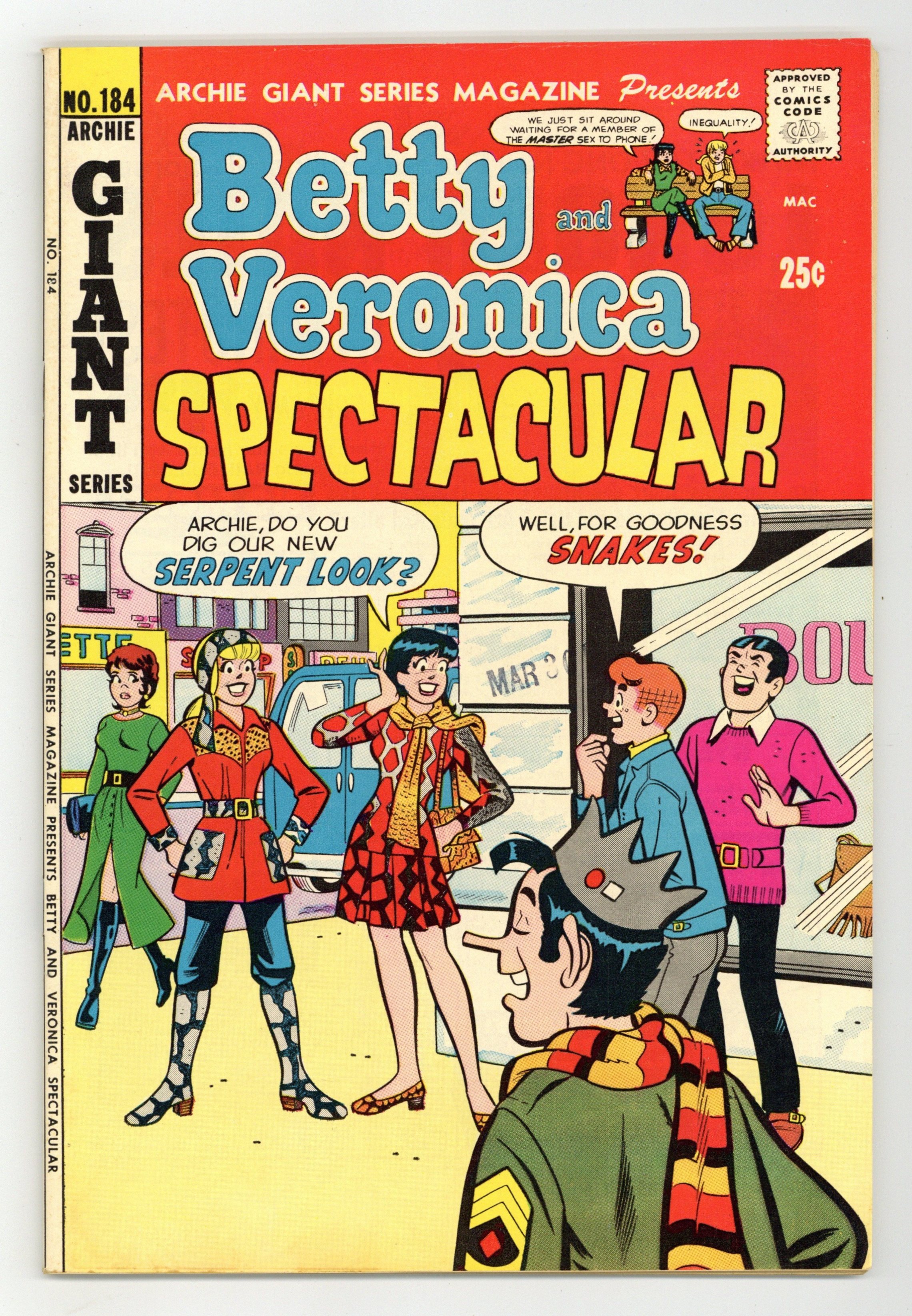 Starts Jan 19 Betty and Veronica Spectacular. "The Meanest Girl in Town"; Veronica is suspicious of a young teen ostensibly collecting for charity; She has no sympathy when the girl is injured, and provokes the police to investigate. "That's Show Biz," pencils by Dan DeCarlo, inks by Bob White; Betty has the lead in a play with gorgeous visiting movie star Rock Bottom; A jealous Veronica spikes Betty's water jug with alum so that she loses her voice, and understudy Veronica replaces her. "Oh, Doctor"; Betty reads a medical encyclopedia, and soon convinces both herself and everyone else that they're suffering strange symptoms. "The Athlete," script by Dick Malmgren, pencils by Dan DeCarlo, inks by Rudy Lapick; Veronica is so impressed with Reggie's athletic accomplishments that Archie tries to match Reggie's performance. "The Rich Get Results," script by Frank Doyle, pencils by Dan DeCarlo, inks by Rudy Lapick; Veronica shows off how efficiently Mr. Lodge's troubleshooters can tackle any problem, and inadvertently has an elephant shipped to Jughead. "The Agent"; Disgusted with waiting for boys to call for dates, Betty and Veronica hire Dilton as their agent. "Indian Giver"; Archie is disgusted with how badly Veronica treats Betty, so Veronica makes it up by telling him to take Betty to a dance, while she goes with Reggie. 76 pgs., full color. Cover price $0.25.