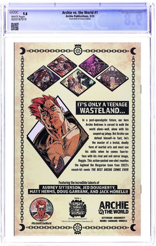 Great Wall of Comics Exclusive Variant Cover by Dan Parent. Written by Aubrey Sitterson. Art by Jed Dougherty. In a post-apocalyptic future, our hero Archie Andrews is cursed to walk the world alone-well, alone with his souped-up jalopy. But Archie can defend himself-in fact, he's the master of a brutal, deadly form of martial arts and must use his skills when he comes face-to-face with his rival and evil mirror image, Reggie. This action-packed one-shot is equal parts Mad Max: Fury Road and The Fist of the North Star, and reunites the Jughead the Burgarian team from 2022's smash-hit comic THE BEST ARCHIE COMIC EVER! 32 pages, full color. Rated Teen+