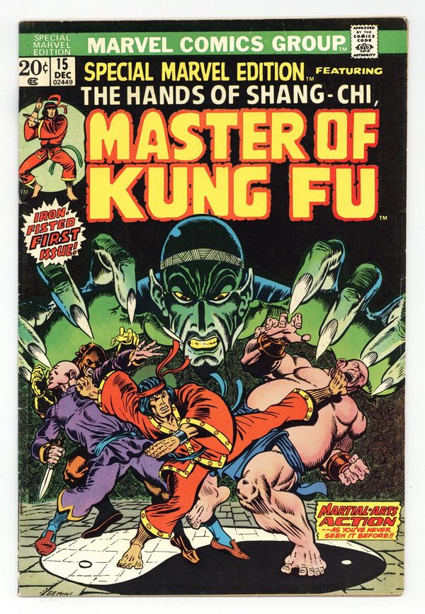 Starts Jul 4 Written by Steve Englehart and Jim Starlin. Art and cover by Jim Starlin and Al Milgrom. Shang Chi, making his first appearance, is a master of martial arts and the son of Fu Manchu, a Chinese mandarin and scientist. Fu Manchu sends Shang Chi to England in order to assassinate the evil Dr. Petrie for the common good. Shang Chi reluctantly agrees, but after the deed is done he is confronted by Sir Denis Nayland Smith, a former British intelligence officer who tells him the truth about Fu Manchu; that he is a nearly immortal evil mastermind. Shang Chi travels back to his father's secret lair in New York and renounces him. Text articles by Roy Thomas and Englehart about the creation of Shang-Chi. Ad for Astonishing Tales #21. A brief obituary for Syd Shores. Ad for the Marvel fan club FOOM (Friends of Ol' Marvel). 36 pages, full color. $0.20. Cover price $0.20.