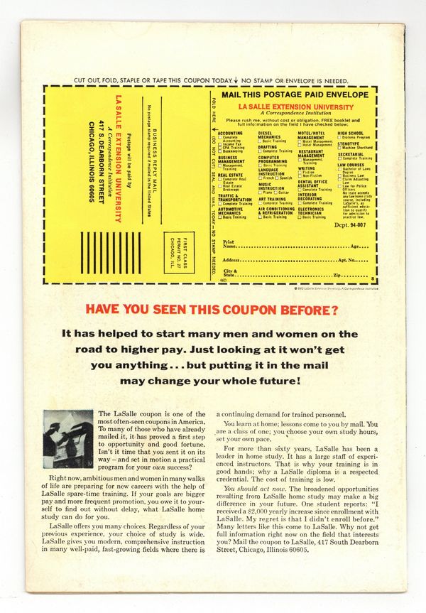 Starts Apr 4 Cover pencils by Jay Scott Pike. Ad for Green Lantern #65 and Brave & Bold 81. 1st appearance of Dolphin in The Fantasy at 14 Fathoms!, script and art by Jay Scott Pike; US Navy frogmen cut into a sunken WWII Navy ship to retrieve documents from a vault; And spot a white-haired girl(!) at the sea bottom; When she's brought aboard, she turns blue from suffocation--because she has gills; With regular dips in the ocean, she falls for Chris and learns some English. Ad for Ideal's Captain Action, Action Boy, and Dr. Evil toys, art by Kurt Schaffenberger. Ad for 80-Page Giant Superman #212. The Kid from Atlantis!, script by Robert Bernstein, art by Ramona Fradon; Aquaman helps Aqualad, a rejected child from Atlantis, to overcome his fear of fish; Aquaman adopts Aqualad as his sidekick. Article on "What's In a Fanzine." Ad for Captain Action #2, art by Gil Kane. 36 Pages, Full Color. Cover price $0.12.