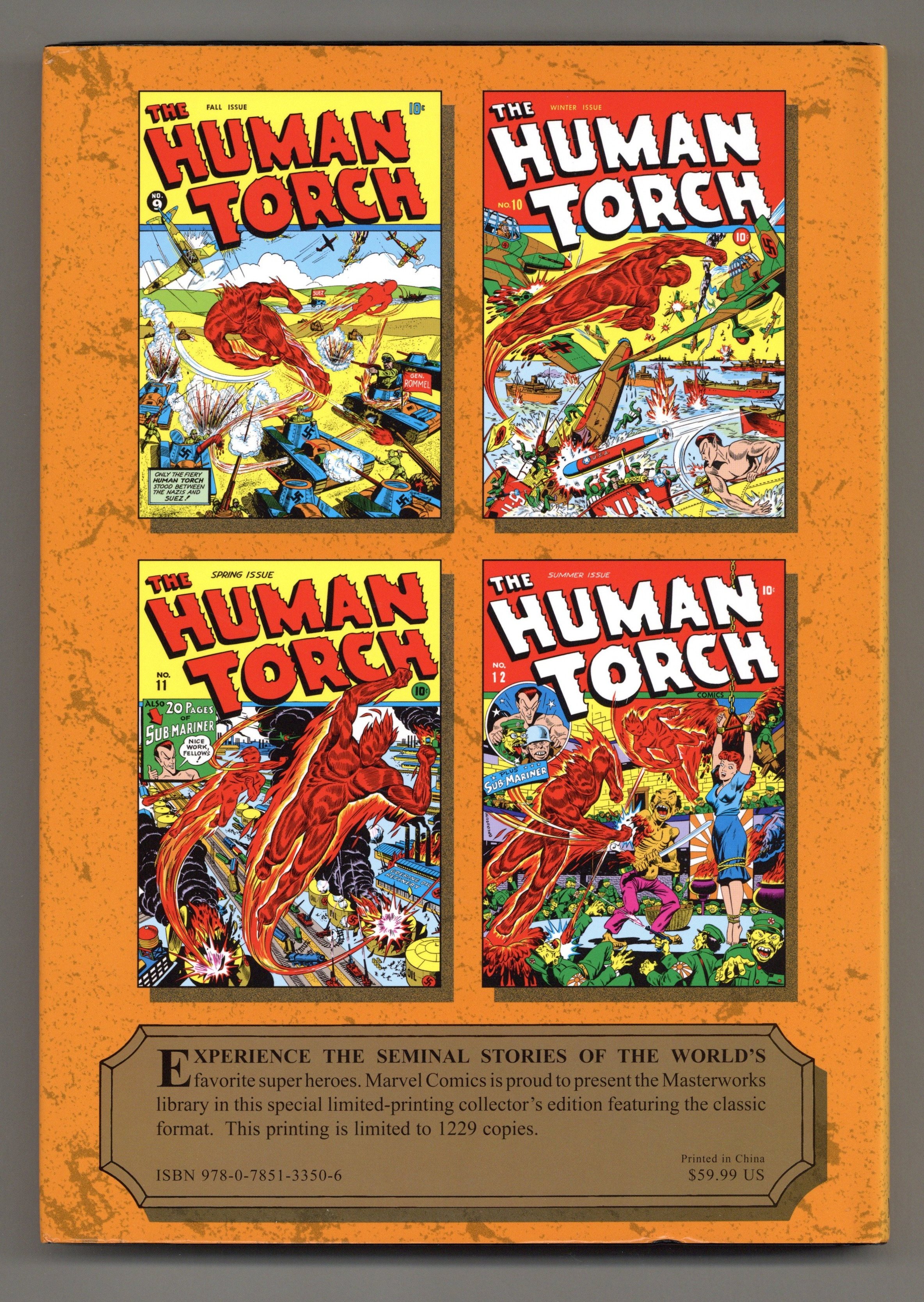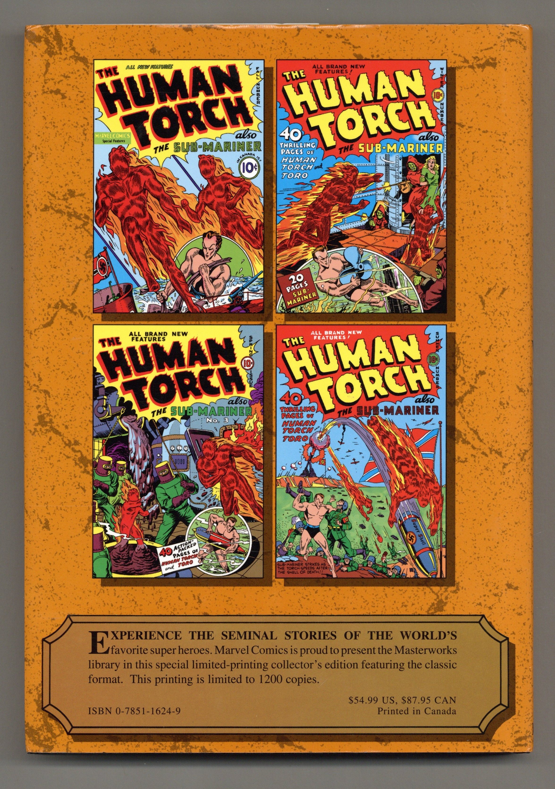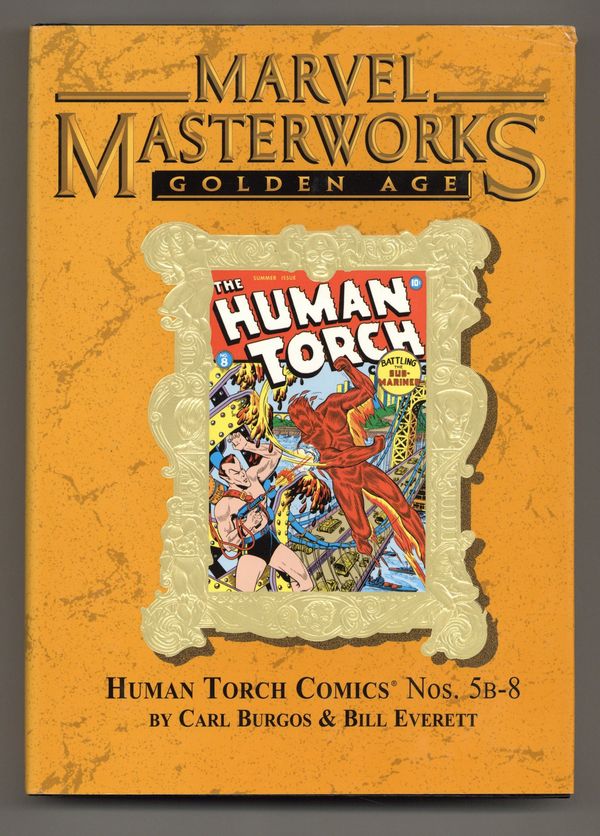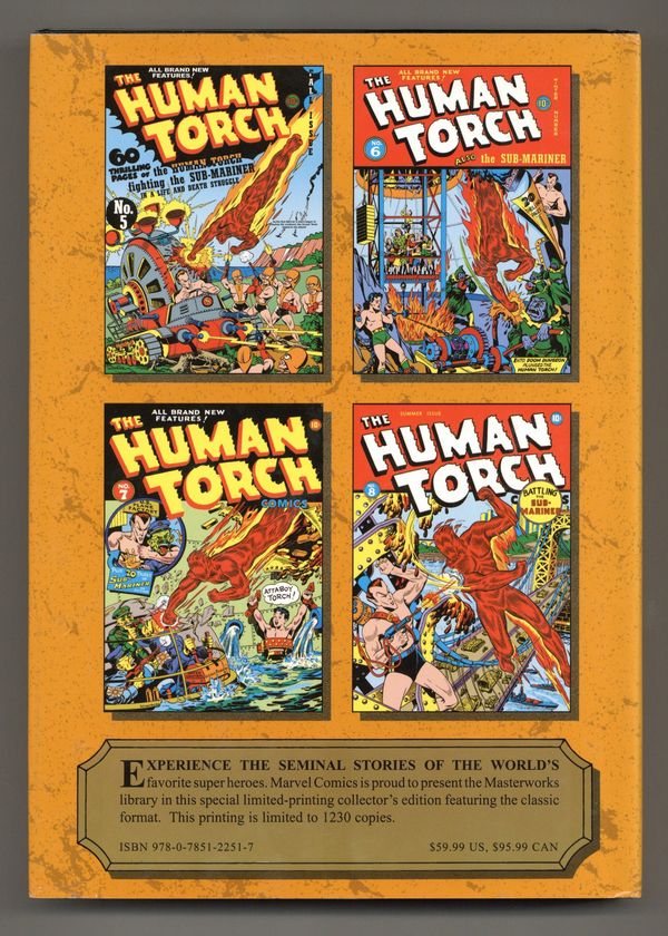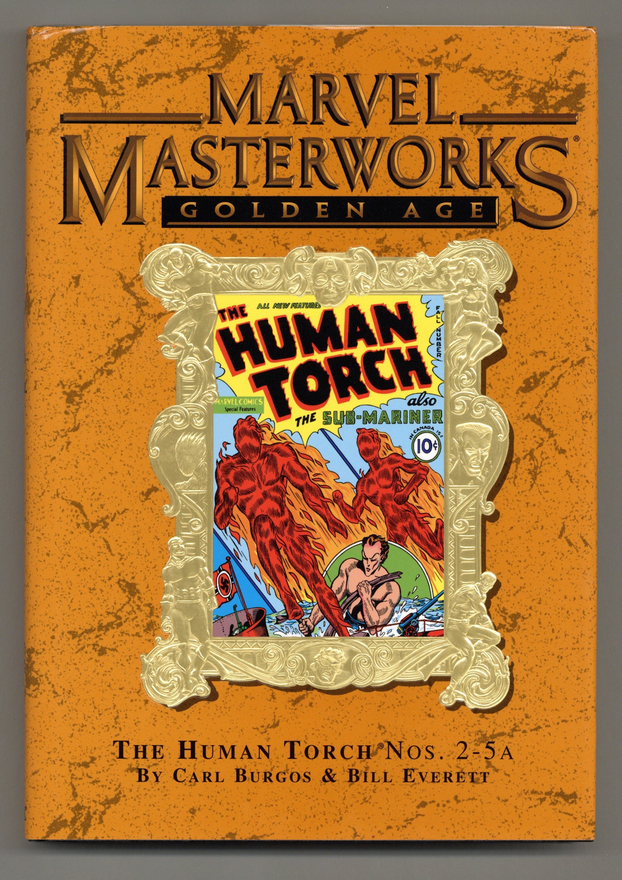 Starts May 4 Volume 51 - 1st printing. "GOLDEN AGE HUMAN TORCH" Collects Human Torch (1940) #2-5a. Written & Illustrated by CARL BURGOS, BILL EVERETT, and JOE SIMON. Cover by ALEX SCHOMBURG. Introduction by Roy Thomas. Marvel presents more Golden Age goodness, reprinting the first four issues of HUMAN TORCH, 2-5a, from 1940-41. (Yes, folks, odd numbering was not solely the province of modern comic books; the Torch's solo book started with issue 2 and had two 5s.) This hardcover collection remasters and restores these early adventures, including the introduction and origin of Toro, the Flaming Torch Kid. See the Torch and Toro fight side-by-side with the Sub-Mariner, as he once again crashes into New York City! Also featuring the adventures of Microman, Mantor the Magician, the Fiery Mask and the Patriot. Hardcover, full color. Cover price $54.99.