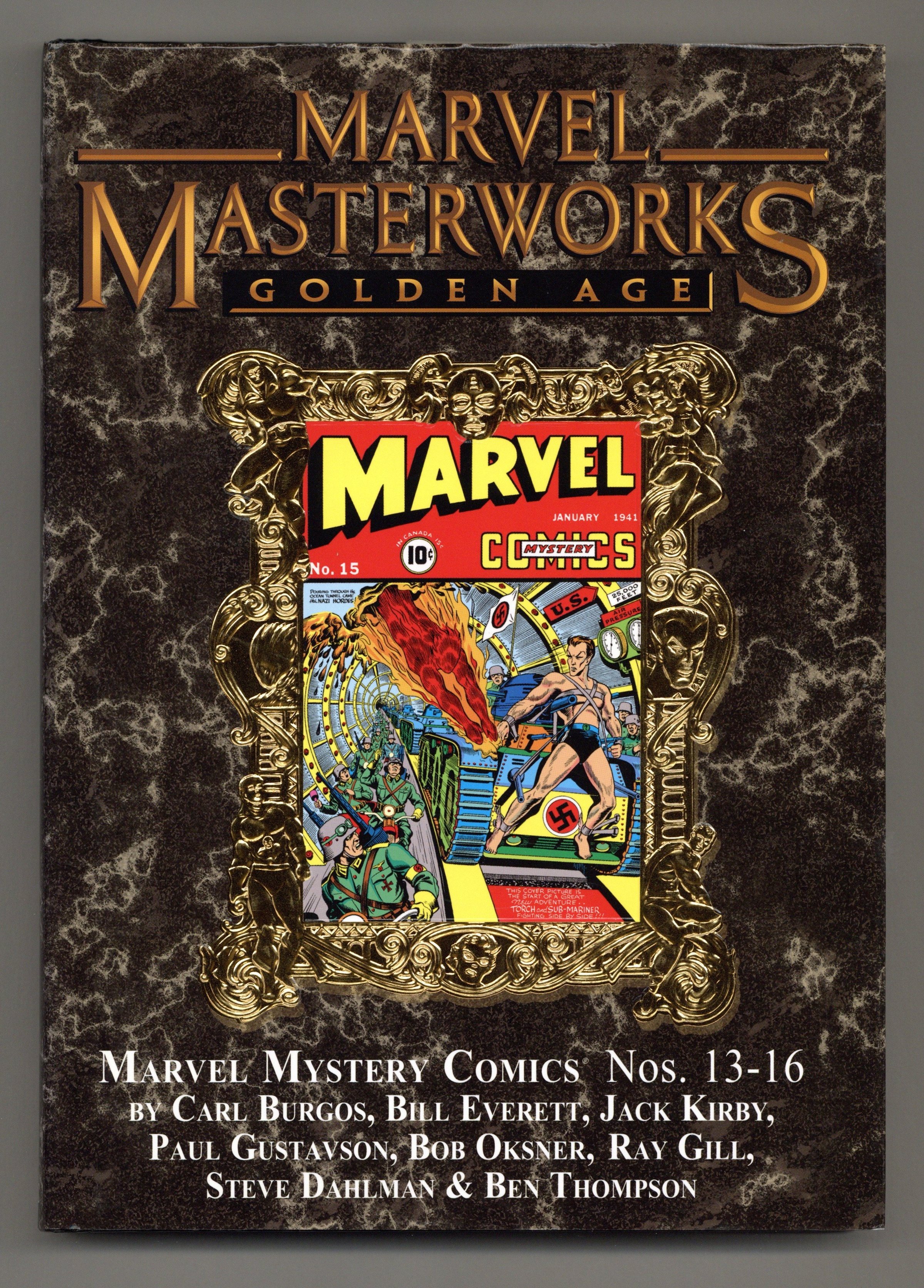 Starts May 4 Volume 116 - 1st printing. "Golden Age of Marvel Comics" Collects Marvel Mystery Comics (1939-1949) #13-16. Written by JOE SIMON, RAY GILL,and ANDREW MCWHINEY. Art by CARL BURGOS, BILL EVERETT, JACK KIRBY, PAUL GUSTAVSON, STEVE DAHLMAN, BOB OKSNER and BEN THOMPSON. Cover by ALEX SCHOMBURG. And now the flagship title of Marvel's Golden Age REALLY heats up! From day one Marvel Comics brought you Carl Burgos' blazing Human Torch and Bill Everett's undersea powerhouse Sub-Mariner, but two of the Golden Age's most thrilling characters just wasn't enough for MARVEL MYSTERY COMICS-Enter, the Vision! Created by Timely's titanic team of Joe Simon and Jack Kirby, the Vision, burst into the Earthly world via Professor Enoch Mason's dimension smasher and brought to MARVEL MYSTERY COMICS an eerie crime-noir serial that sealed the comic's place at the very top of the Golden Age's greatest! Joined by the crime-fighting Angel, boy-adventurer Terry Vance, the caterwauling science fiction tales of Electro, and Ka-Zar's jungle action, there's no comparison for variety and excitement, so celebrate Marvel's 70th anniversary and reserve your copy today! Hardcover, 280 pages, full color. Cover price $59.99.
