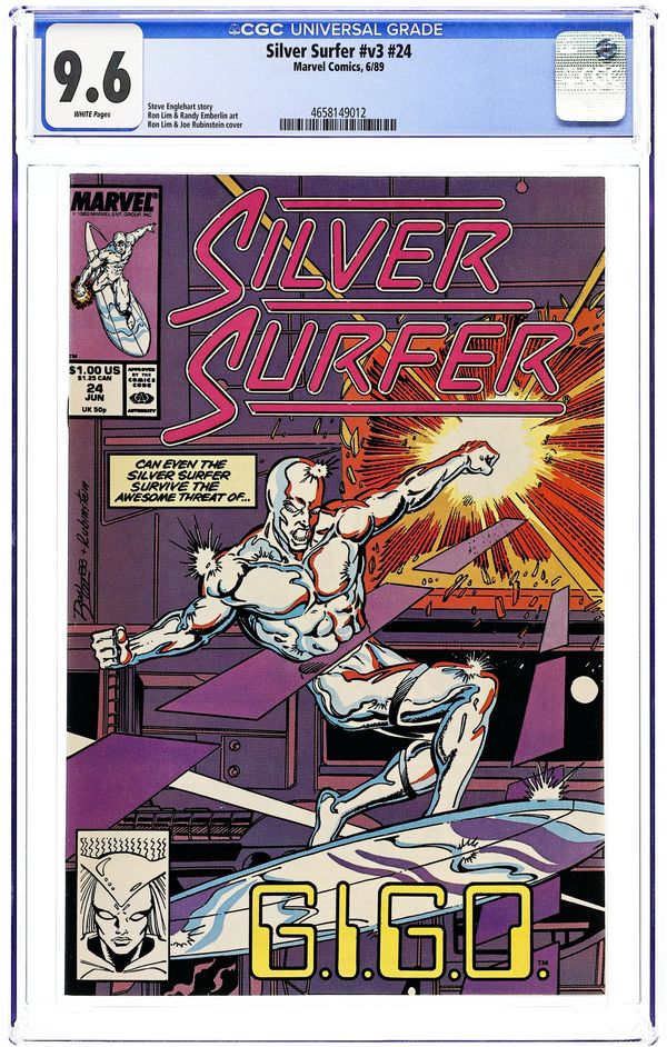 "G.I.G.O." Story by Steve Englehart. Art by Ron Lim and Randy Emberlin. When the Silver Surfer arrives on a planet that is one giant computer with A.I., the planet mistakes Norrin Radd for still being the Herald of Galactus and defends itself accordingly. Can even the Surfer survive an assault by an entire planet? 32 pages. Cover price $1.00.