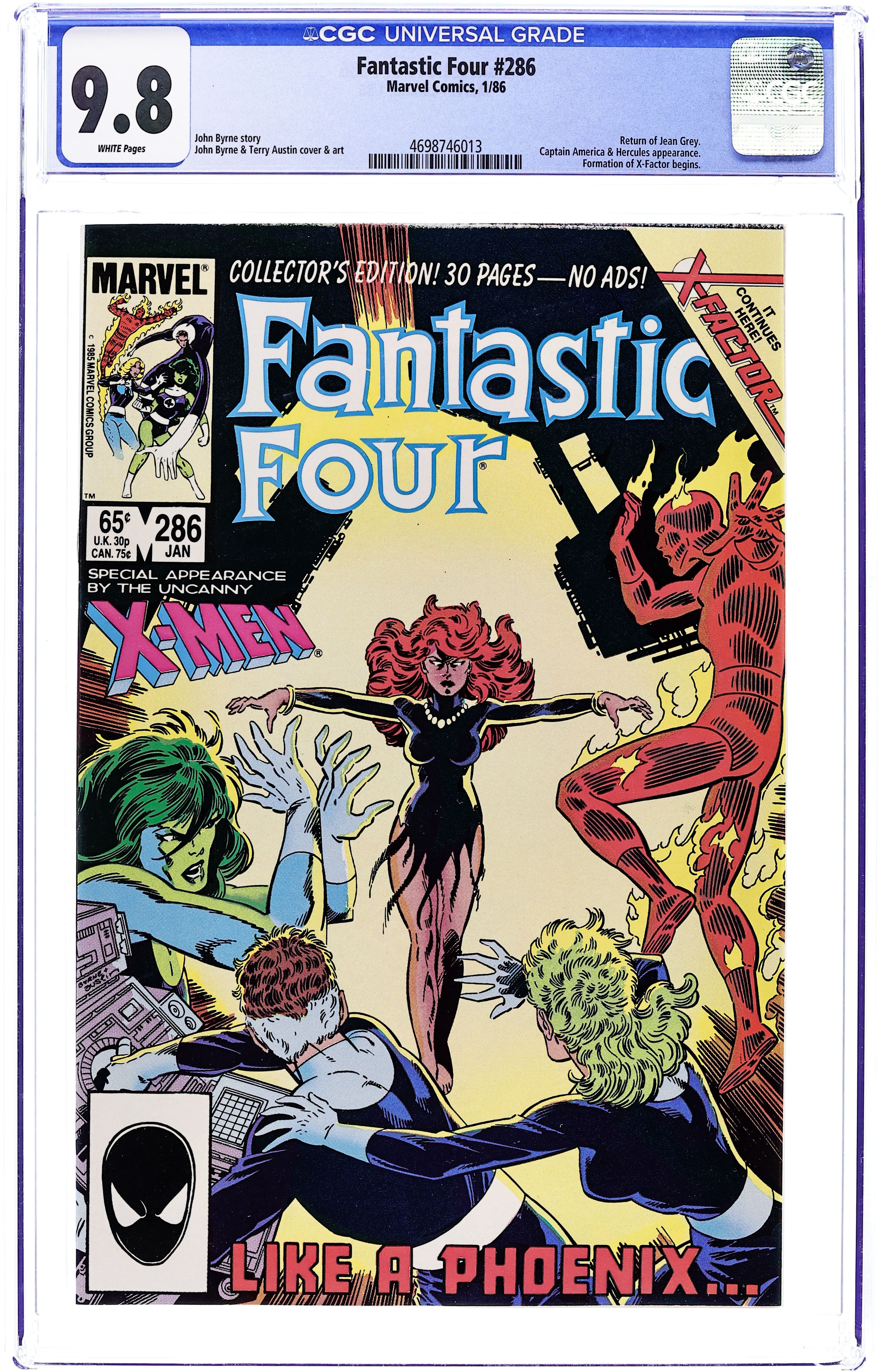 Direct Edition. Last 65-cent issue. Return of Jean Grey: Part 2 of 3 - X-Factor tie-in. "Like a Phoenix!" Guest-starring the Uncanny X-Men and Avengers. Story by John Byrne. Art by John Byrne and Terry Austin. Cover by John Byrne. Story continued from Avengers (Vol. 1) #263. Don't miss the startling return of Jean Grey! How did she survive, and where has she been? The answers will shock and surprise you. Plus, this issue sets the stage for the return of the of the original X-Men! Story continues in X-Factor (1986-1998 1st Series) #1. 36 pgs. Cover price $0.65.