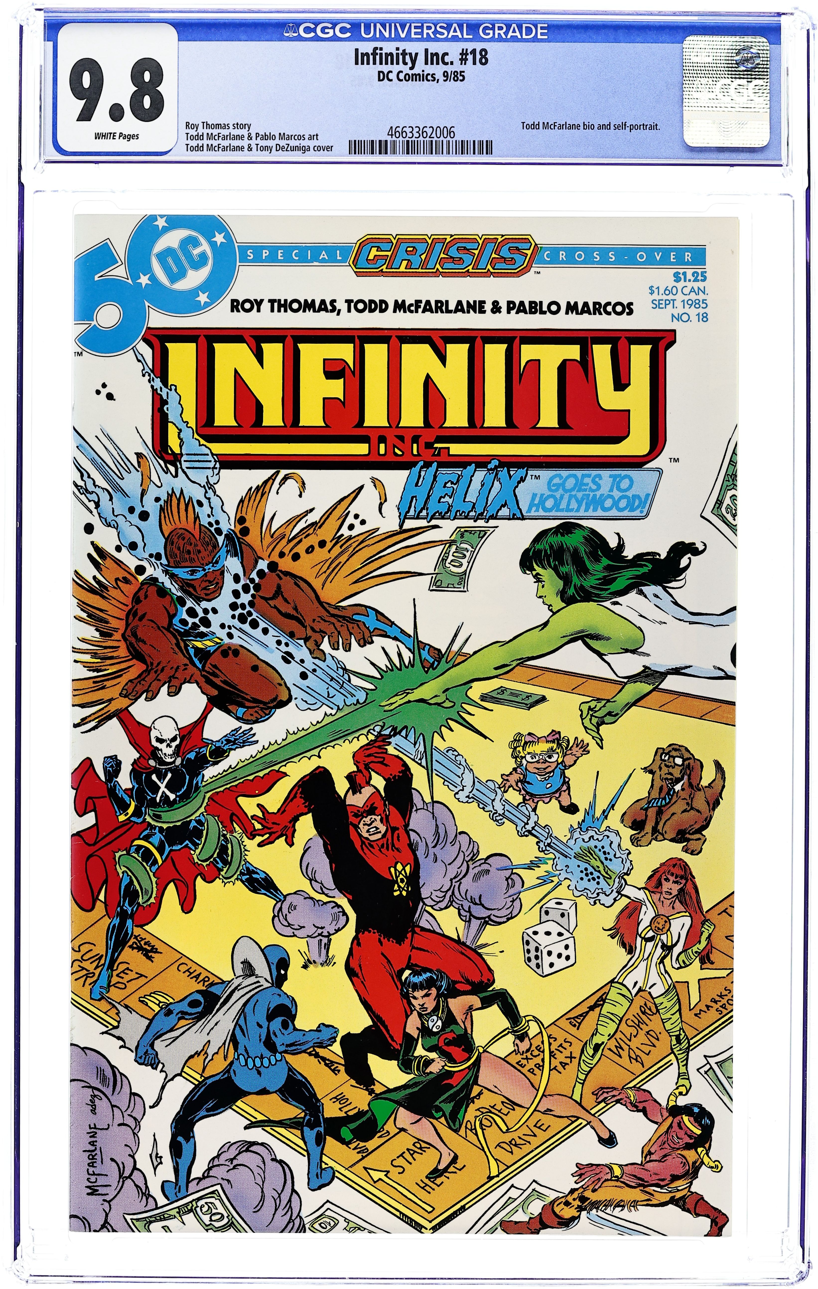 Crisis On Infinite Earths crossover. Commander Steel and Mekanique recruit Infinity Inc. to travel to Earth-One and take on the JLA in "Last Crisis On Earth-Two!" Part 1 of 2, continued in Justice League of America #244. Script by Roy Thomas, co-plot by Dann Thomas, pencils by Todd McFarlane, inks by Steve Montano. Letters page includes profile of McFarlane written and drawn by McFarlane himself. McFarlane/Tony DeZuniga cover. Cover price $1.25.