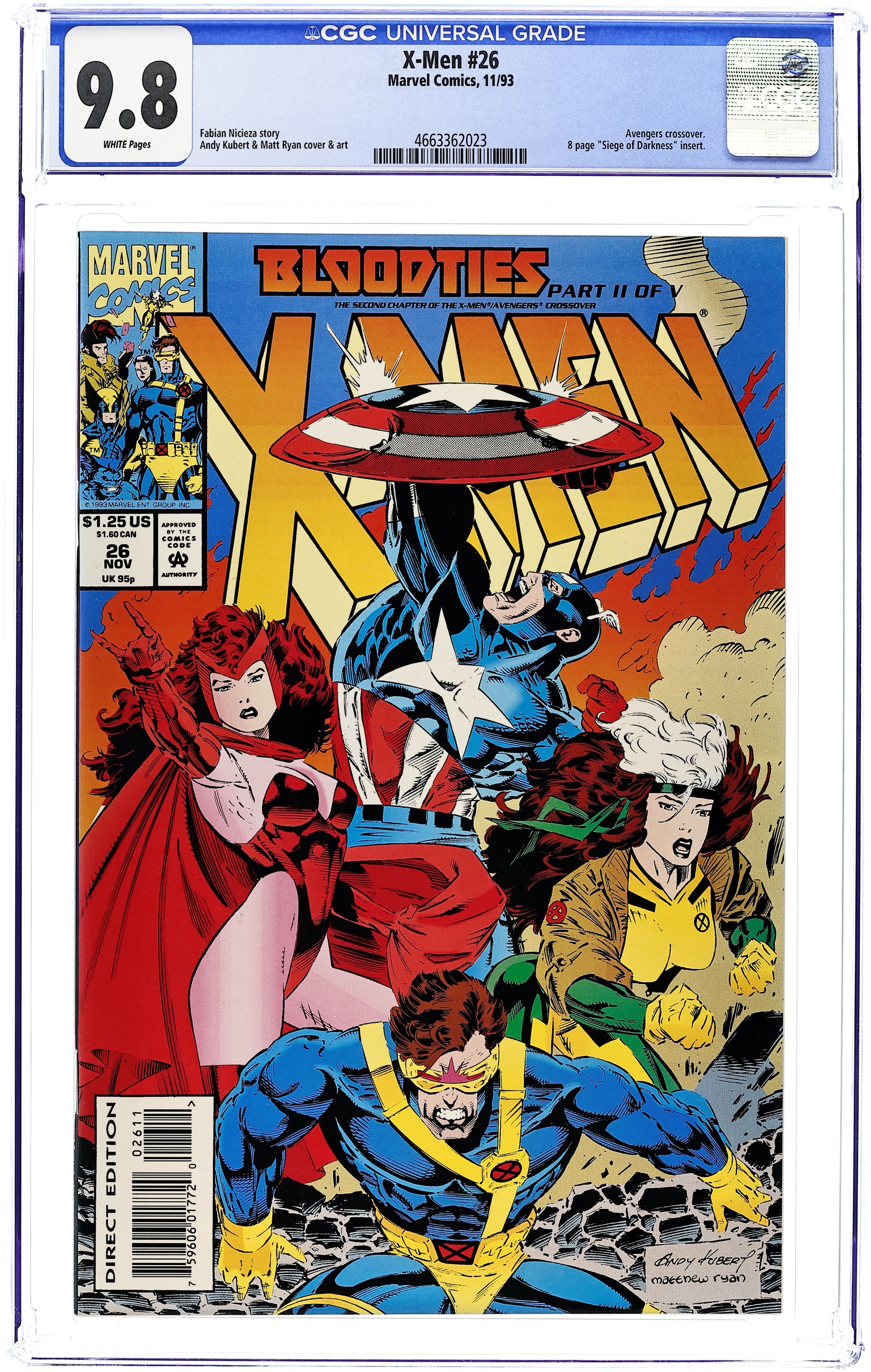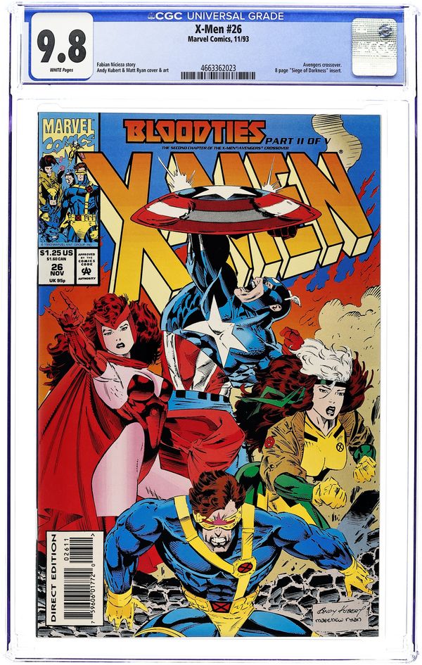 "Civil Disobedience!" Bloodties Part 2 of 5. Guest-starring Nick Fury and the Avengers. Script by Fabian Nicieza. Pencils by Andy Kubert. Inks by Matthew Ryan. Cover by Andy Kubert and Matthew Ryan. Story continues from Avengers 368. All roads lead to Genosha as both the X-Men and the Avengers rush to the embattled island nation to rescue little Luna! But before Earth's Mightiest Heroes can depart for the troubled country, they must first knock out an army of SHIELD agents and Nick Fury! Once the interfering SHIELD troops are subdued, Captain America leads the Black Knight, Scarlet Witch, Crystal, Sersi, and War Machine into the heart of Hammer Bay! While just north of the city, the Uncanny X-Men arrive and quickly run into Fabian Cortez and his advance guard…the Unforgiven! And elsewhere in Genosha; Professor X, Hank McCoy, and the U.S. Agent work their way towards the vile prisons where the mutates are locked up! So everyone is in Genosha…but can anyone stop the bloodshed? Story continues in Avengers West Coast 101. Cameo appearances by Dum Dum Dugan, Colossus, Exodus, and Magneto. Avengers Lineup: Black Knight, Black Widow, Captain America, Crystal, Giant-Man, Hercules, Sersi, Hawkeye, Scarlet Witch, Spider-Woman, U.S. Agent, War Machine, and the Vision. X-Men Lineup: Archangel, Beast, Bishop, Cyclops, Gambit, Iceman, Jean Grey, Psylocke, Quicksilver, Rogue, and Storm. (Notes: This issue features a 14-page insert previewing Marvel's Midnight Sons "Siege of Darkness" crossover event. The Bloodties saga was reprinted in 1995 in a trade paperback titled Avengers-X-Men Bloodties.) 32 pages. Cover price $1.25.