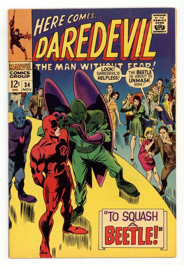 Starts Jan 3 Cover pencils by John Romita, inks by Frank Giacoia. Spider-Man guest stars in None Are So Blind!, script by Stan Lee, pencils by John Romita Sr., inks by Frank Giacoia (as "Frank Ray"); Spidey, thinking he has discovered Daredevil's secret, accuses Foggy of being DD; Foggy kind of plays along to impress Karen; DD and Spidey stop fighting long enough to take down the Masked Marauder. 36 pgs. Cover price $0.12. Cover price $0.12.