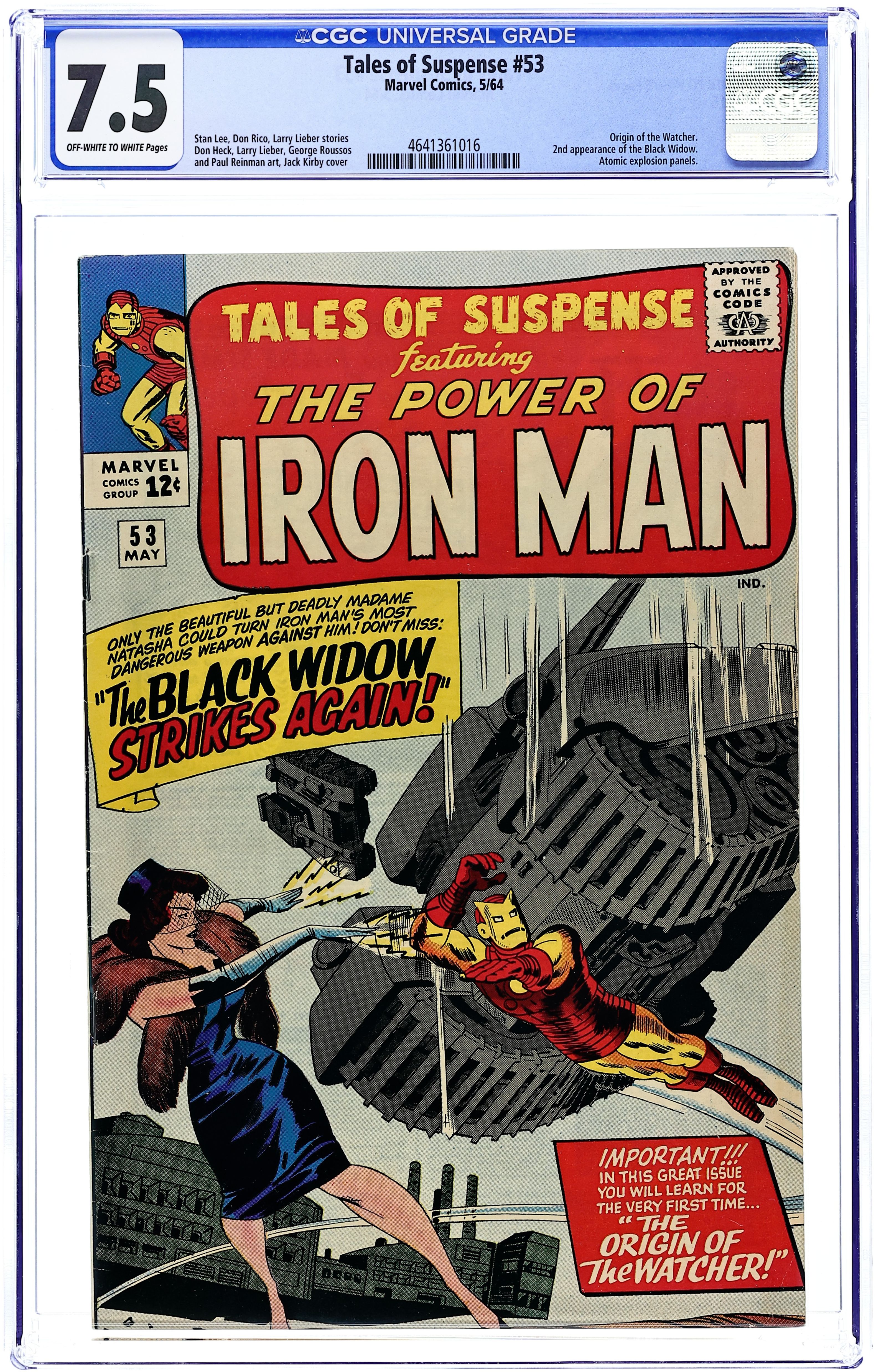 Starts Jan 3 Cover pencils by Jack Kirby, inks by Sol Brodsky. Second appearance of the Black Widow in "The Black Widow Strikes Again!", script by Stan Lee (plot) and Don Rico (as N. Korok), art by Don Heck; To redeem herself in the eyes of the communist leader, Black Widow steals the new anti-grav ray device developed by Tony Stark and attacks Fort Knox; Iron Man destroys the ray device, but the Black Widow escapes. "The Magician" text story. "The Omen," script by Stan Lee (plot) and Larry Lieber (script), pencils by Larry Lieber, inks by George Roussos (as George Bell); A superstitious warlord thinks a flare of light is a good omen for an invasion, but when it is discovered to be a meteor his entire world must evacuate in order to survive. The Watcher origin in the fifth Tales of the Watcher, "The Way It Began," script by Stan Lee (plot) and Larry Lieber (script), pencils by Larry Lieber, inks by Paul Reinman; The Watcher comes from a super-advanced race that decides to share its technology with others; When their first attempt ends in tragedy, they vow never to interfere with the affairs of less advanced species. The second half of "The Magician" (text story). 36 pages, full color. Cover price $0.12.