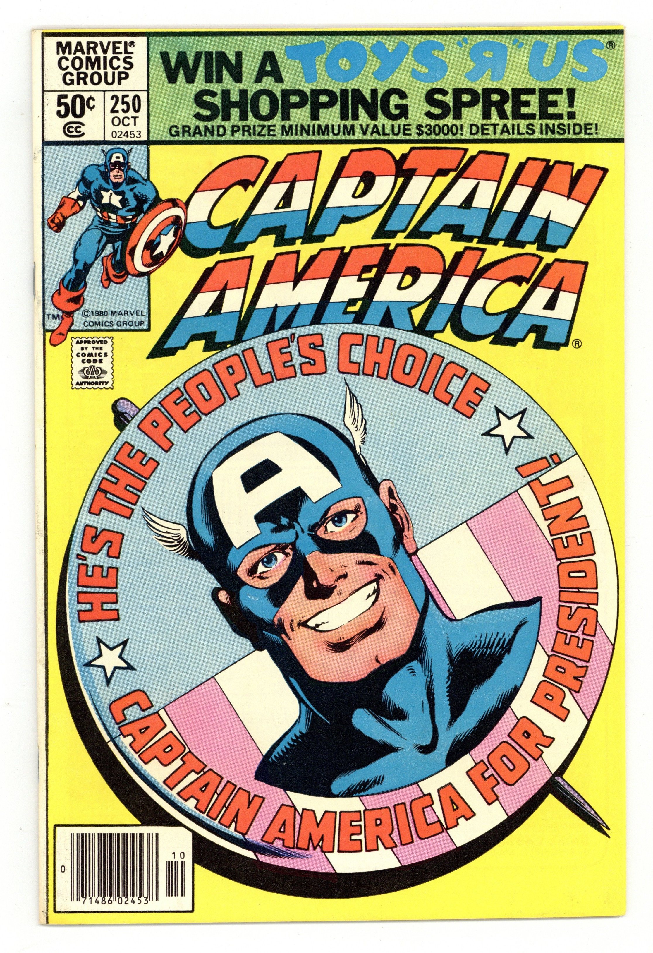 Starts Jan 19 Newsstand Edition. "Cap for President!" Plot by Roger McKenzie and Don Perlin. Script by Roger Stern. Art by John Byrne (breakdowns) and Joe Rubinstein (finishes). Cover by John Byrne and Joe Rubinstein. The candidates are lining up for the 1980 presidential election: Jimmy Carter, Ronald Reagan, and Captain America? The New Populist Party wants Cap to run for the presidency as their party's candidate! What will America's shield-slinger decide to do? Cameo appearances by Bernie Rosenthal, Jarvis, Dr. Strange, Daredevil, Nick Fury, Spider-Man, Beast, Iron Man, Vision, and the Wasp. 36 pages. Cover price $0.50.