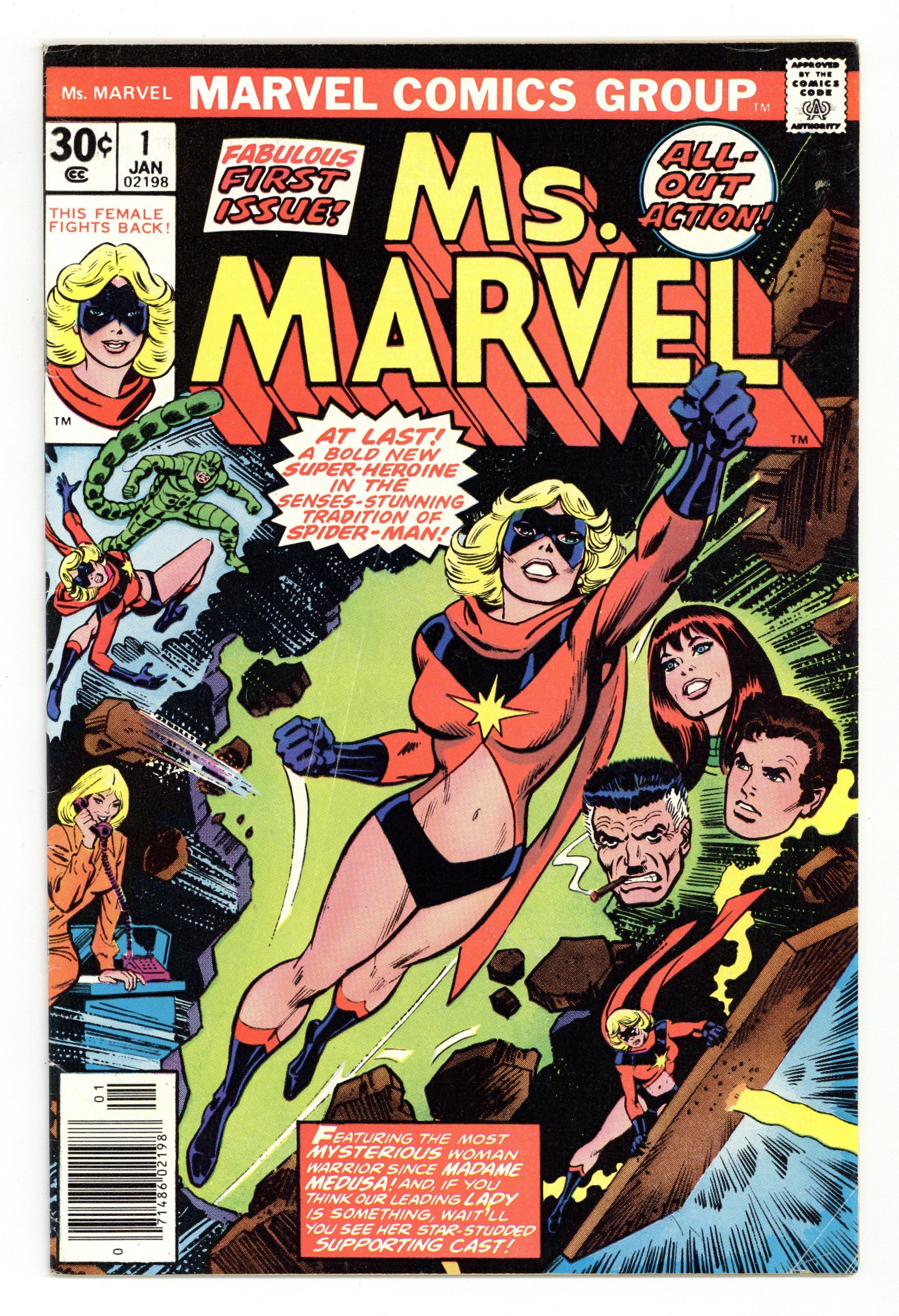 Starts Jan 19 John Romita/Dick Giordano cover. John Buscema art. Gerry Conway script. Joe Sinnott/David Hunt inks. Marie Severin colors. "This Woman, This Warrior" Carol Danvers meets Peter Parker, J. Jonah Jameson, Mary Jane Watson, and battles the Scorpion when she gets a job at the Daily Bugle as a fashion editor. Intro Ms. Marvel, Carol Danvers, who last appeared in Captain Marvel # 40. 1st appearance of Ms Marvel. 36 pages, full color. Cover price $0.30.