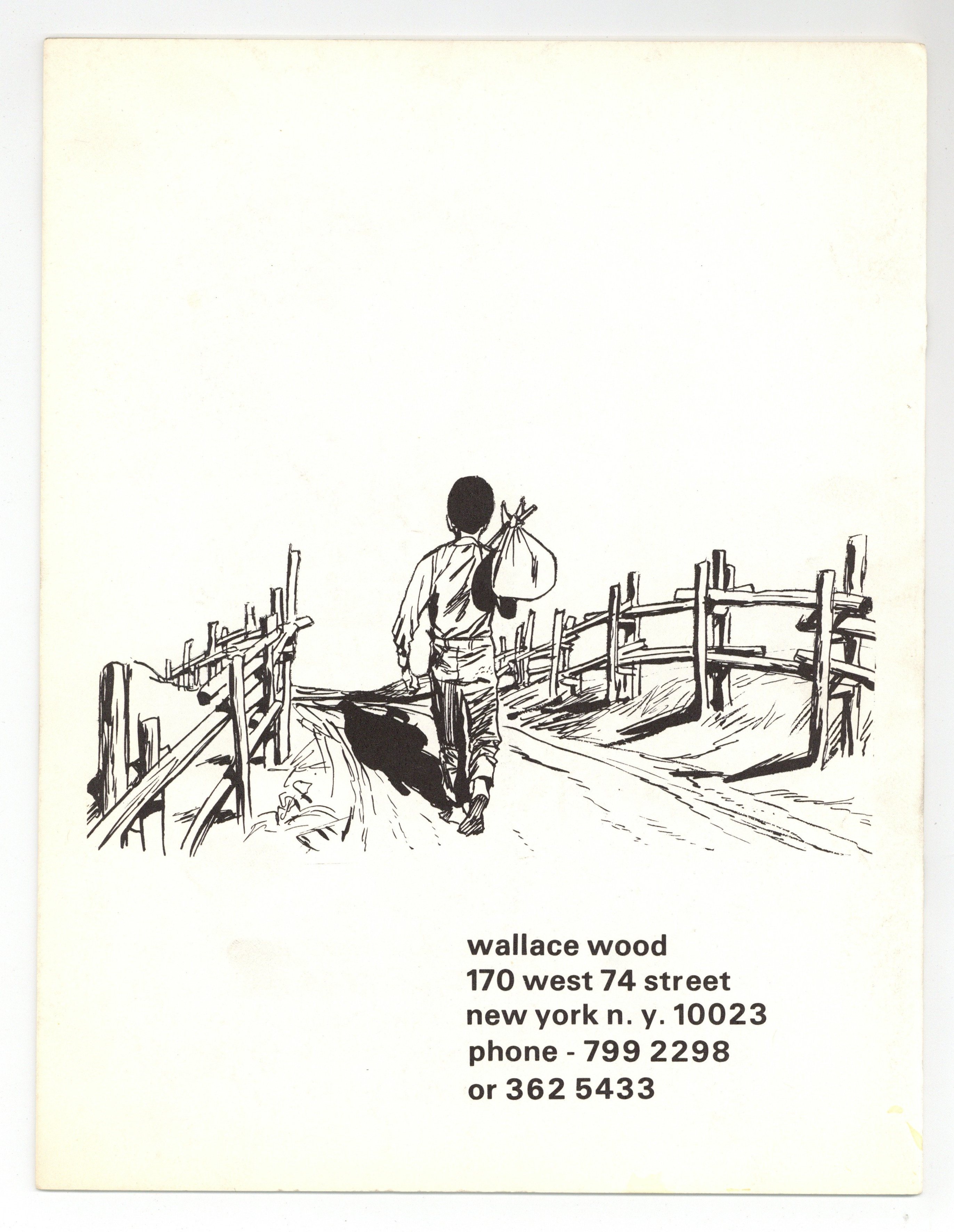 This saddle-stitched portfolio book by Wallace "Wally" Wood contains a sampling of his illustrations for Mad Magazine, Galaxy Magazine, Witzend Magazine, and Blazing Combat magazine, as well as some of his advertising work for Alka-Seltzer, American Airlines, and the Chemstrand Corporation. 16 pages (covers included), 8-1/2" x 11", B&W.