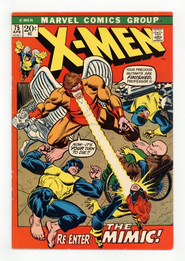 Cover pencils by Gil Kane, inks by John Romita. Re-Enter: The Mimic, script by Roy Thomas, pencils by Werner Roth, inks by Dick Ayers; Angel rests in the way of getting the wake of getting hit with Cyclops' optic blast; Mimic recovers his powers and memories; the X-Men battle the Puppet Master; Cameos by Spider-Man and the Fantastic Four; ; reprinted from issue 27.. A Marvel Masterwork Pin-Up of Jean Grey, pencils by Jack Kirby, inks by Chic Stone. 36 pgs. $0.20. Cover price $0.20.
