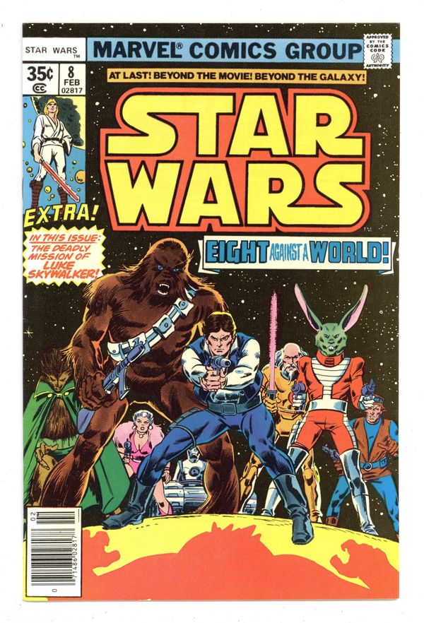 1st printing Newsstand. "Eight for Aduba-3!" Written by Roy Thomas. Art by Howard Chaykin and Tom Palmer. Han Solo and Chewbacca join forces with a motley band of misfits to embark on a dangerous adventure. Meanwhile, Luke Skywalker sets out on a dangerous mission of his own. Cover price $0.35.
