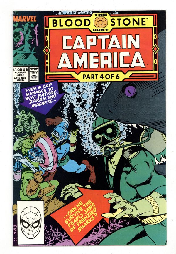 Direct Edition. "Blood in the Sea" Part 4 of 6. Story by Mark Gruenwald and Kieron Dwyer. Art by Kieron Dwyer and Danny Bulanadi. Cover by Kieron Dwyer and Al Milgrom. Off the Bermuda shore, an undersea battle is in progress among Captain America, Batroc, Machete, and Zaran; when suddenly a school of sharks decides to join the action! Meanwhile, Diamondback sneaks on board Baron Zemo's yacht and pilfers two of the bloodstone jewels. At the end of the day, Cap and Diamondback have two of the five bloodstone jewels and Baron Zemo has one. The hunt for the remaining two continues in Egypt. First appearance of Crossbones. Back up story: "Conflagration" Part 3 of the Night of the Scourge. Story by Mark Gruenwald. Art by Mark Bright and Don Hudson. The U.S. Agent battles Scourge, but only one of them will be left standing by night's end! 36 pgs. Cover price $1.00.