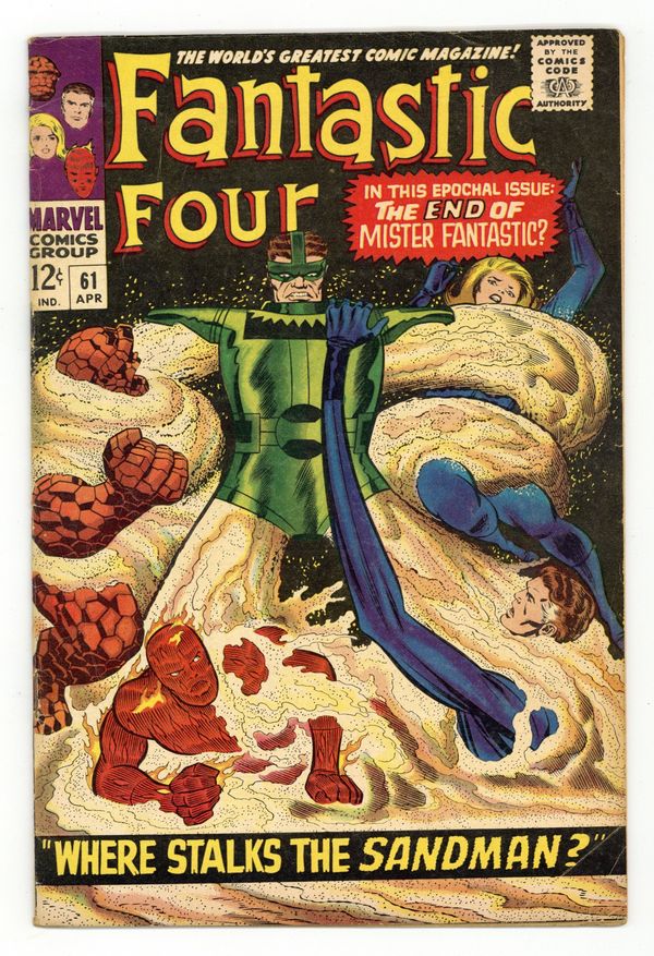 Tags: Fantastic Four$26.00Cover pencils by Jack Kirby, inks by Joe Sinnott. Where Stalks the Sandman?, script by Stan Lee and Jack Kirby (co-plot), pencils by Jack Kirby, inks by Joe Sinnott; The Sandman attacks the FF. During the battle, Reed is pulled into the Negative Zone and feared dead. Brief appearances by the Silver Surfer, the Inhumans, and Peter Parker. Reprinted in Marvel's Greatest Comics # 44. 36 pgs. $0.12. Cover price $0.12.