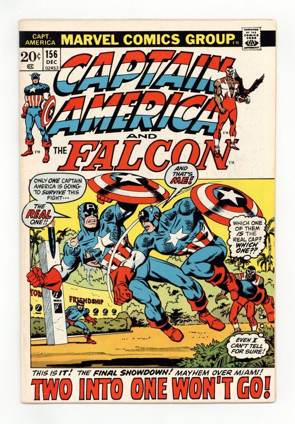 Tags: Marvel Legacy Numbering: Captain America (part 156), Captain America$20.00"Two into One Won't Go!" Part 4 of 4. Script by Steve Englehart. Pencils by Sal Buscema. Inks by Frank McLaughlin. Cover by Sal Buscema and Dave Cockrum. In Miami, Florida, at the Torch of Friendship monument, the past collides with the present as the Captain America of the 1950s clashes with the Captain America of today! And only one shield-slinger will walk away from the fantastic fight. In the meantime, while the dual Caps slug it out on Biscayne Boulevard, Agent 13 and the Falcon lock horns with Bucky one final time! Can Steve, Sharon, and Sam bury the heroes of the 1950s in the past forever? A terrific story! Cameo appearance by Brian Muldoon. (Notes: Jack Monroe returns in Captain America 281 & 282 and assumes the identity of Nomad. William Burnside returns earlier in Captain America 232 with a new identity. This four-part story was reprinted in 2018 in the trade paperback: Captain America Hero or Hoax. The TPB collects issues 139 thru 159.) 36 pages. Cover price $0.20.