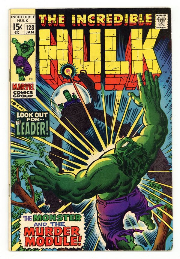 Cover art by Herb Trimpe. No More the Monster!, script by Roy Thomas, art by Herb Trimpe; Mr. Fantastic uses a machine on the Hulk that turns him back into Bruce Banner and allows him to transform into the Hulk at will while still retaining his own intellect; Bruce vows never to become the Hulk again and reunites with Betty who accepts his proposal of marriage; Thunderbolt Ross also makes nice with his soon to be son-in-law but asks him to become the Hulk one last time to protect a new and deadly military weapon during transport; The Leader tries to steal the weapon but is stopped by the Hulk who finds himself feeling more savage as he almost kills his deadliest foe. 36 pgs. $0.15. Cover price $0.15.