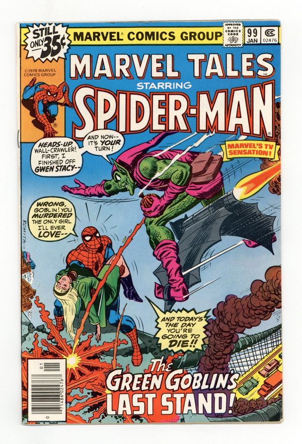 This issue reprints the classic story from Amazing Spider-Man 122. " The Goblin's Last Stand!" Part 2 of 2. Script by Gerry Conway. Pencils by Gil Kane. Inks by John Romita and Tony Mortellaro (backgrounds). Cover by John Romita. In unfathomable fashion atop the Brooklyn Bridge, Gwen Stacy has perished at the hands of the Green Goblin. Spider-Man is devastated. And he furiously lashes out at the goblin, but the purple and green-clad killer gets away. However a while later, the wall-crawler receives a tip from Joe Robertson about Norman Osborn's whereabouts. And in an abandoned and decrepit warehouse, the Amazing Spider-Man and the Green Goblin fight for the final time! Death of Norman Osborn. Cameo appearances by Harry Osborn, and J. Jonah Jameson. (Notes: The stunning death scene of the Green Goblin inspired a similar moment in the 2002 Spider-Man movie. Two pages from the original story are omitted. This issue was the first reprinting of ASM 122.) 32 pages. Cover price $0.35.