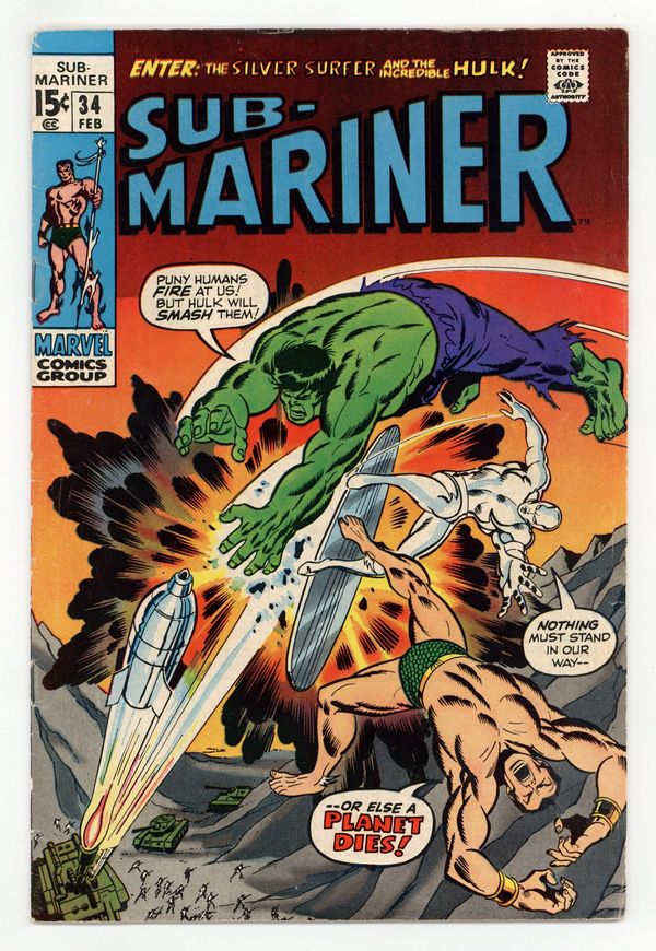 Cover by Sal Buscema. "Titans Three!" part one of two, script by Roy Thomas, pencils by Sal Buscema, inks by Jim Mooney; Sub-Mariner, Silver Surfer and the Hulk help the citizens of a small Central American country overthrow El General; Prelude (with #35) to 1st Defenders story. 36 pgs., full color. $0.15. Cover price $0.15.