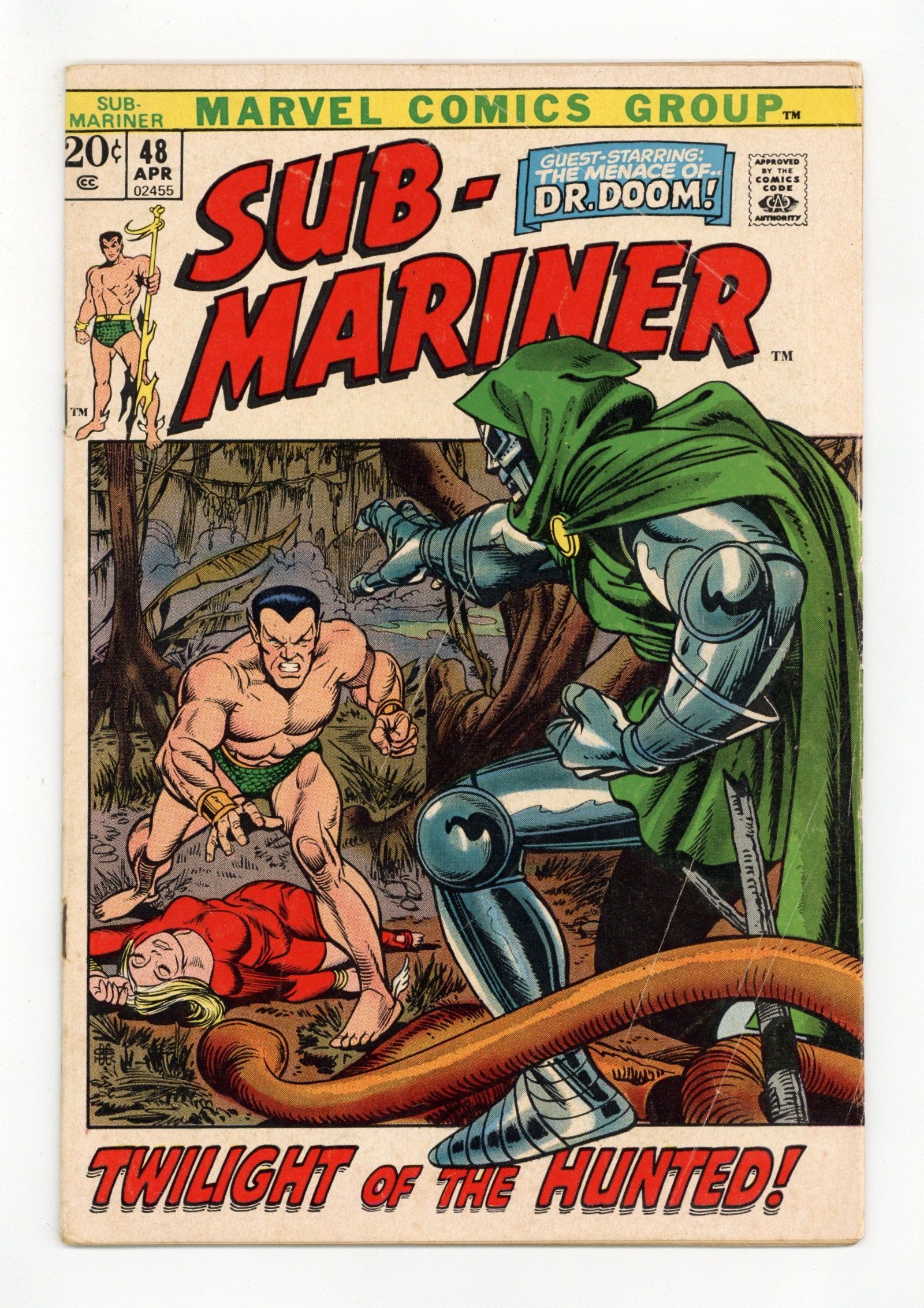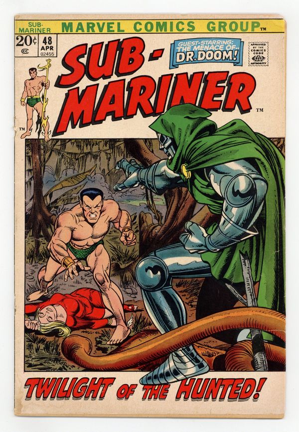 Cover pencils by Gil Kane, inks by Bill Everett. "Twilight of the Hunted," script by Gerry Conway, pencils by Gene Colan, inks by Mike Esposito; As Doom prepares to attack an A.I.M. installation, Namor takes Cindy Jones to her friend's apartment to keep her safe; To ensure Namor's loyalty, Doom kidnaps Cindy and holds her hostage until Namor has helped him get the Cosmic Cube; Namor battles through the defenses of the A.I.M. base only to face Modok and his hordes of androids. 36 pgs., full color. $0.20. Cover price $0.20.