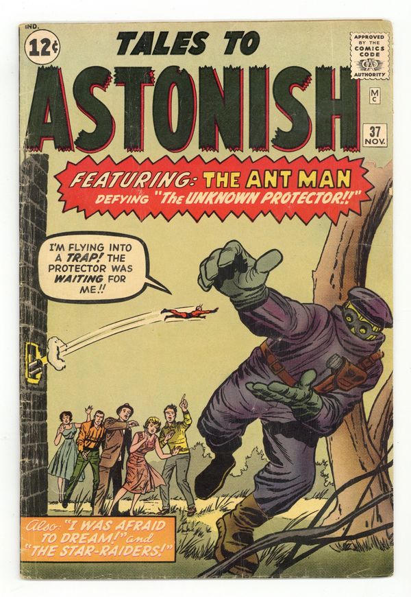 Cover by Jack Kirby and Dick Ayers. Trapped by the Protector! Part 1, script by Stan Lee and Larry Lieber, art by Jack Kirby and Dick Ayers; Ant-Man deals with a dangerous extortionist, who turns out to be disguised as one of the victimized jewelers. [Trapped by the Protector!, Part 2:] Face-to-Face With the Protector!, script by Stan Lee and Larry Lieber, art by Jack Kirby and Dick Ayers. The Magician text story. Afraid to Dream!, art by Don Heck; A man whose dreams come true is terrified when he dreams his own death. The Star Raiders, script by Stan Lee, art by Steve Ditko; A group of escaped convicts turned pirates are tricked into attacking a planet they believe defenseless by a man who claims the inhabitants are midgets neglecting to mention that they are only midgets compared to him. 36 pgs., full color. $0.12. Cover price $0.12.