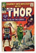 Cover pencils by Jack Kirby, inks by Vince Colletta. "The Trial of the Gods!", script by Stan Lee, pencils by Jack Kirby and Carl Hubbell, inks by Vince Colletta and Carl Hubbell; Odin sends Thor and Loki to Skornheim to endure the Trial of the Gods which will show which one of his sons is lying to him; Against Odin's decree, Loki uses magic to escape the traps of the enchanted land while Thor has to rely on brawn and sheer will; Meanwhile, the Enchantress and the Executioner set about tormenting Jane Foster in a bid to influence the outcome of the trial; Odin sends Balder to deal with them; Guest appearances by the Avengers (Captain America, Iron Man, Giant-Man, and the Wasp), Rick Jones, the Teen Brigade, the Enchantress, and Executioner; There is a minor plot crossover with Fantastic Four 38; Cameos by Daredevil, Medusa, Trapster, Sandman, and the Wizard. "Tales of Asgard" back-up, "The Challenge!", script by Stan Lee, pencils by Jack Kirby, inks by Vince Colletta; On a diplomatic mission, Loki convinces King Hymir to put Thor to a deadly test where failure means slavery to the evil king; Thor, of course, passes the test, much to the annoyance of Hymir who strikes Loki and accuses him of betrayal; First appearance of Princess Rinda and King Hymir. 36 pgs., full color. Cover price $0.12.
