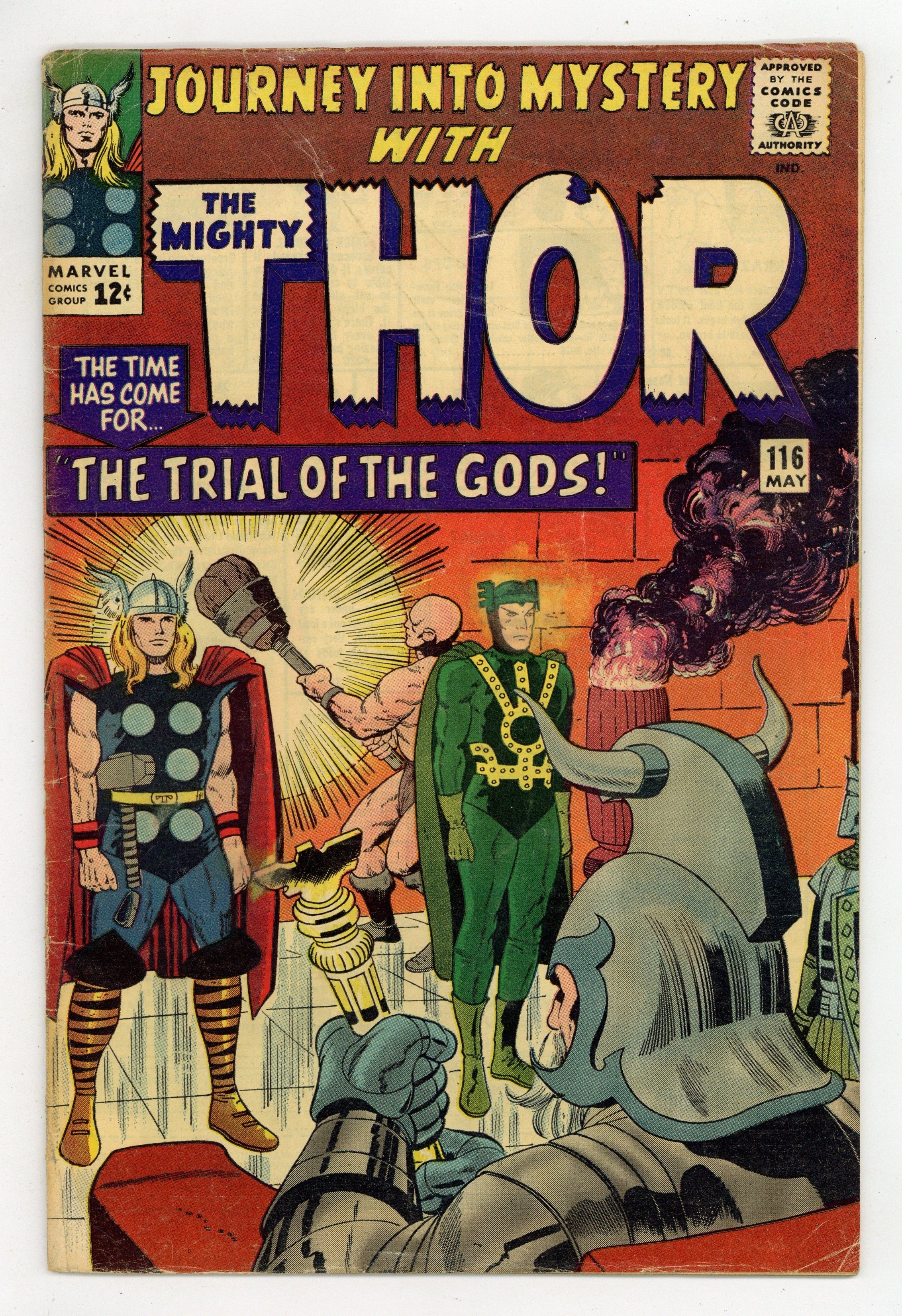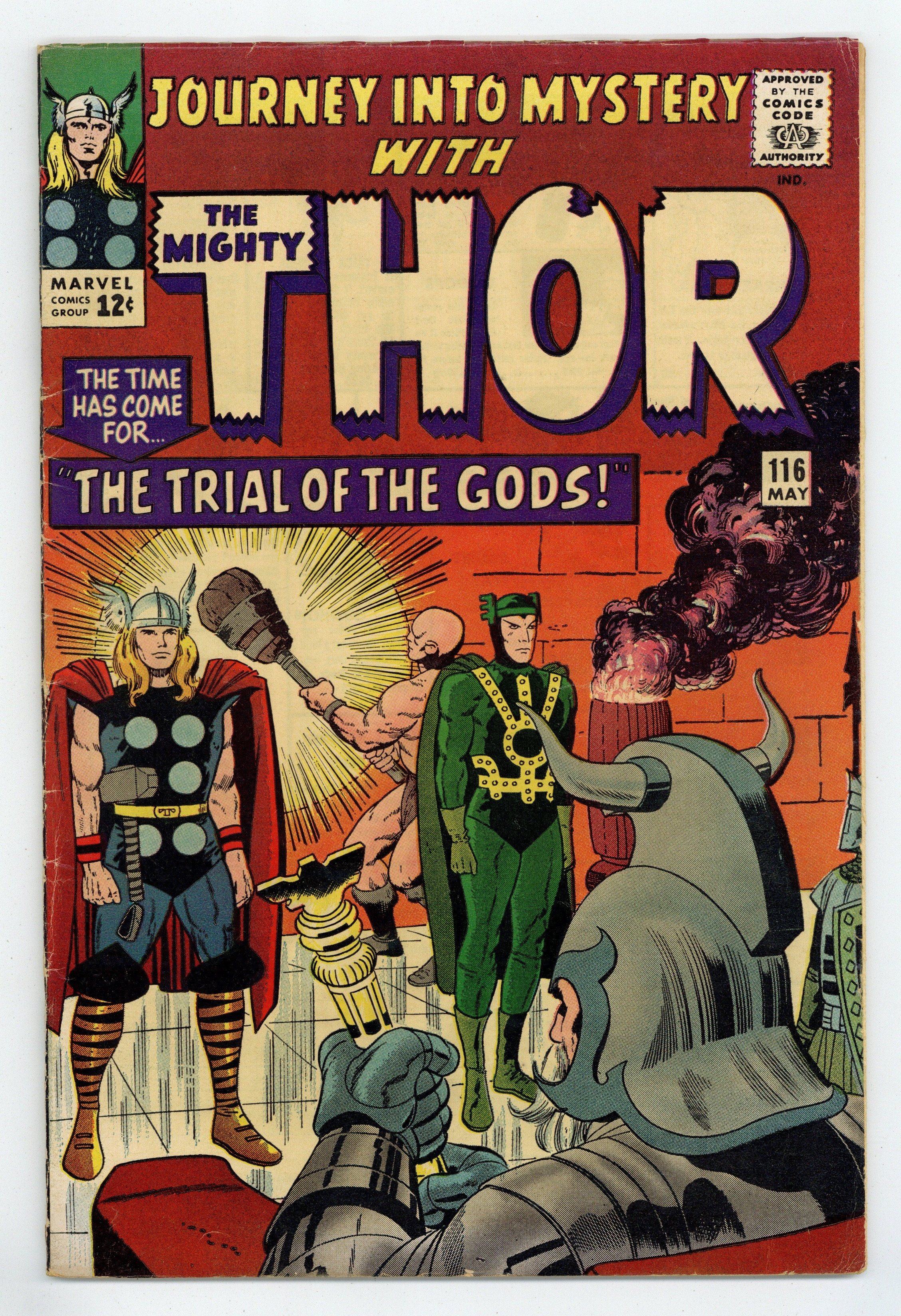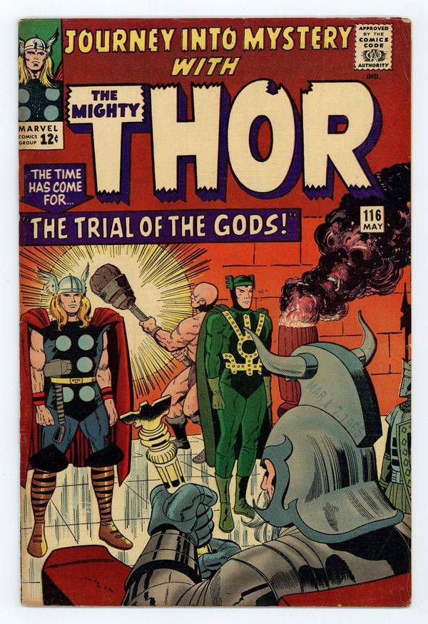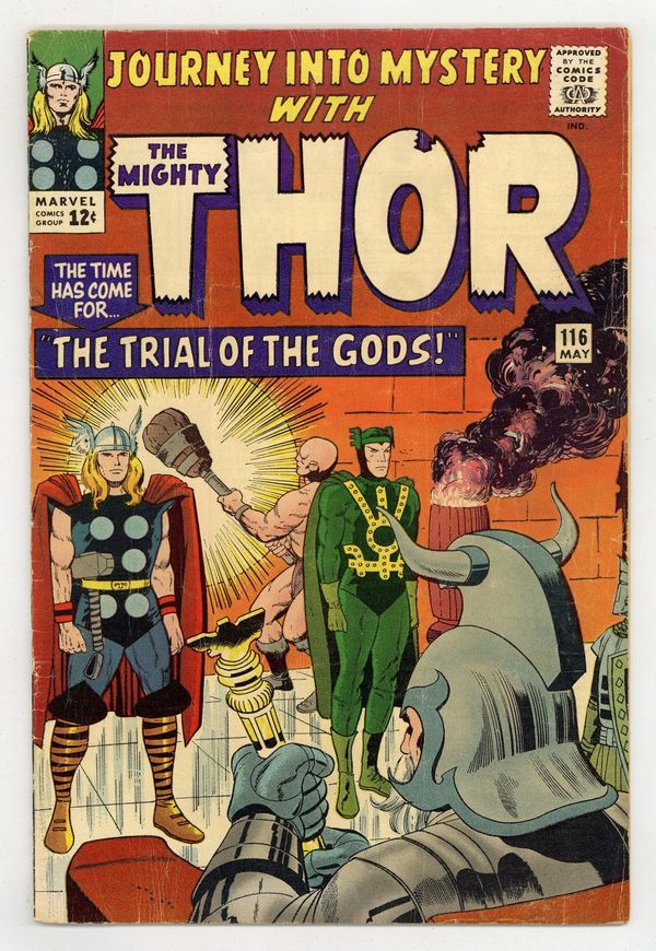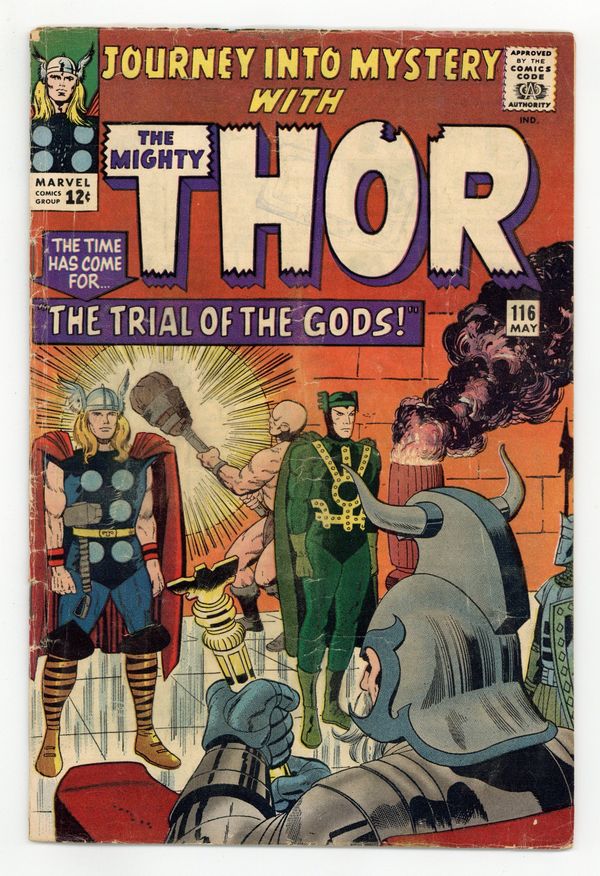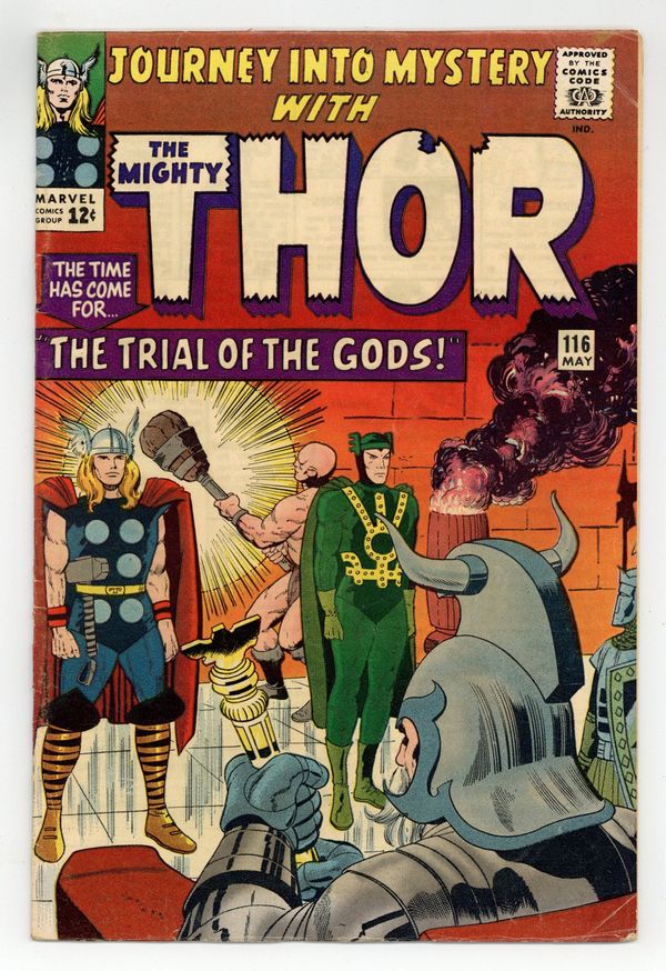Tags: Marvel Legacy Numbering: Thor (part 116), Thor$23.00Cover pencils by Jack Kirby, inks by Vince Colletta. "The Trial of the Gods!", script by Stan Lee, pencils by Jack Kirby and Carl Hubbell, inks by Vince Colletta and Carl Hubbell; Odin sends Thor and Loki to Skornheim to endure the Trial of the Gods which will show which one of his sons is lying to him; Against Odin's decree, Loki uses magic to escape the traps of the enchanted land while Thor has to rely on brawn and sheer will; Meanwhile, the Enchantress and the Executioner set about tormenting Jane Foster in a bid to influence the outcome of the trial; Odin sends Balder to deal with them; Guest appearances by the Avengers (Captain America, Iron Man, Giant-Man, and the Wasp), Rick Jones, the Teen Brigade, the Enchantress, and Executioner; There is a minor plot crossover with Fantastic Four 38; Cameos by Daredevil, Medusa, Trapster, Sandman, and the Wizard. "Tales of Asgard" back-up, "The Challenge!", script by Stan Lee, pencils by Jack Kirby, inks by Vince Colletta; On a diplomatic mission, Loki convinces King Hymir to put Thor to a deadly test where failure means slavery to the evil king; Thor, of course, passes the test, much to the annoyance of Hymir who strikes Loki and accuses him of betrayal; First appearance of Princess Rinda and King Hymir. 36 pgs., full color. Cover price $0.12.