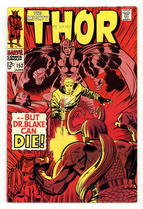 Tags: Marvel Legacy Numbering: Thor (part 153), Thor$16.00Cover pencils by Jack Kirby, inks by Vince Colletta. "But Dr. Blake Can Die!", script by Stan Lee, pencils by Jack Kirby, inks by Vince Colletta; Loki has stolen Thor's hammer and fled to Midgard; Thor and Sif pursue him, but without the hammer Thor changes into Don Blake as Loki attacks them. Loki escapes, but Sif is injured in the fight, and Dr. Blake must operate to save her life. Appearances by Balder, Karnilla, and Odin. 36 pgs., full color. $0.12. Cover price $0.12.