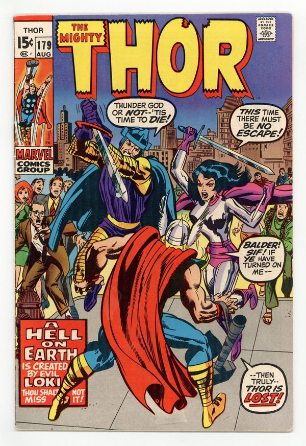 Tags: Marvel Legacy Numbering: Thor (part 179), Thor$15.50Cover pencils by Neal Adams and John Romita (alterations). Loki switches bodies with Thor in "No More the Thunder God!", script by Stan Lee, pencils by Jack Kirby, inks by Vince Colletta and John Verpoorten; Surveying the battle done by Surtur, Thor and the Warriors Three encourage the warriors of Asgard to rebuild and repair the damage done; Later Thor meets with Sif and the two have a brief romantic moment before Thor is greeted by Odin, who wishes the Thunder God to go to Earth and search for Loki; As Odin transports Thor to Earth, Loki has shacked up in a posh penthouse using his magical tricks to make it appear that he is wealthy; He awaits Thor's arrival as his magician is preparing a special trap to use against the Thunder God. Letter to the editor from DC Comics editor Neal Pozner. 36 pgs., full color. $0.15. Cover price $0.15.