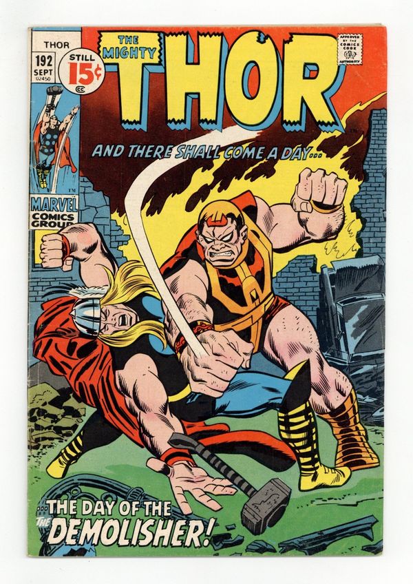 Tags: Marvel Legacy Numbering: Thor (part 192), Thor$15.00Last 15-cent cover price. Cover pencils by John Buscema, inks by Frank Giacoia. "Conflagration!", script by Stan Lee, pencils by John Buscema, inks by Sam Grainger; Loki boasts that he his new creation Durok the Destroyer will prove to be the end of Thor, after sending both to Earth to fight it out; Furious at Loki's evil Hogun attempts to strike the trickster with his mace, however Loki deflects it and is about to sentence the Warriors Three to death when Sif manages to talk Loki out of it; Loki then decides to turn his attention to Earth to watch the battle between Thor and Durok; On Earth, Durok appears in New Orleans during Mardi Gras, and begins to rampage through a parade when Thor arrives to battle him. Appearances by Balder, Fandral, Volstagg, Karnilla, and Odin. Silver Surfer cameo. 36 pgs., full color. $0.15. Cover price $0.15.