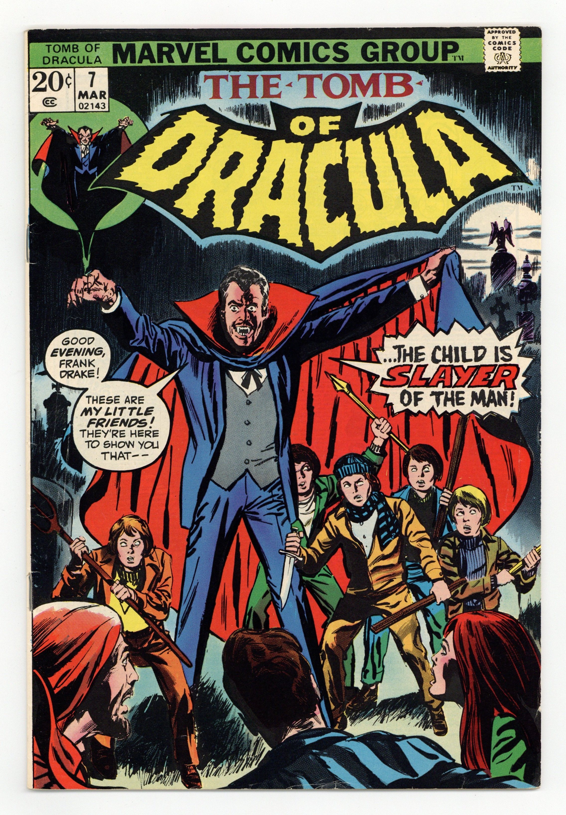 "Night of the Death Stalkers!" Written by Marv Wolfman. Art by Gene Colan and Tom Palmer. Cover by Neal Adams. The harsh cold of winter descends on London and brings with it the terror known as Dracula. When the Count's enemies gather tot plot his demise, Dracula attacks using the most unthinkable weapon of all - the children! 32 pages, FC. NOTE: 1st appearance of Quincy Harker. Marv Wolfman begins his epic run on series. Cover price $0.20.