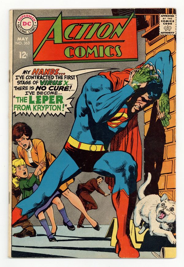 Tags: Superman$15.25Cover by Neal Adams. "The Leper from Krypton," script by Leo Dorfman, pencils by Ross Andru, inks by Mike Esposito; While in prison, Luthor develops a new strain of Virus X, a deadly Kryptonian disease, and manages to smuggle it out to Ventor Caine so that Superman can be infected. Legion of Super-Heroes ad. "The Landmark Looters!", script by Otto Binder, art by Kurt Schaffenberger; Supergirl encounters two alien children who steal Earth's landmarks as part of a game. 36 Pages, Full Color. $0.12 Cover price $0.12.