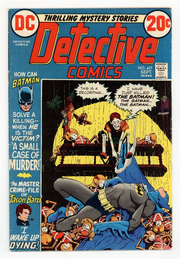 Cover by Mike Kaluta. "A Small Case of Murder!," script by Frank Robbins, pencils by Irv Novick, inks by Dick Giordano; Batman investigates the case of a toy manufacturer murdered by a gun-wielding toy doll. "I Wake Up Dying!," script by Frank Robbins, art by Don Heck; Jason Bard is set up for a killing after being hired to find a gangsters lost wife. 36 pgs., full color. $0.20. Cover price $0.20.