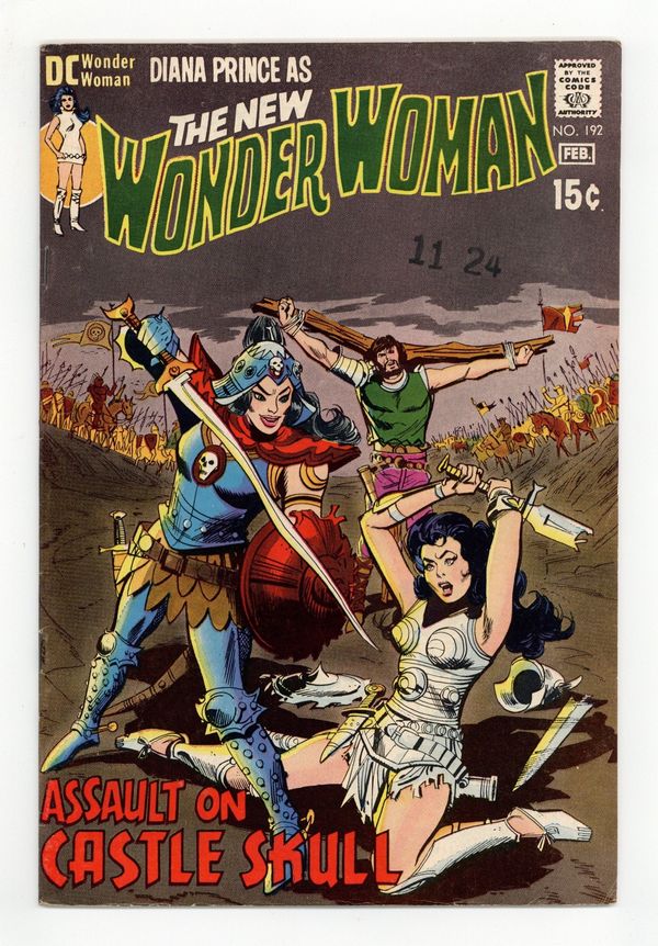 Tags: Wonder Woman$22.50Cover pencils by Mike Sekowsky, inks by Dick Giordano. "Assault on Castle Skull," script and pencils by Mike Sekowsky, inks by Dick Giordano; The North Ambrians take heavy losses in assaulting Castle Skull until Diana devises cannons for them to breach the walls; Finally, the Queen of Chalandor and her champion, Thang, agree to meet Diana and Thanagor in single combat; Thanagor kills Chang, and the queen refuses to fight Diana afterward; The North Ambrian army finally takes the city, and the queen is sentenced to wandering the countryside, where her formerly-tyrannized subjects will undoubtedly take revenge. 36 pages, Full Color. Cover price $0.15.