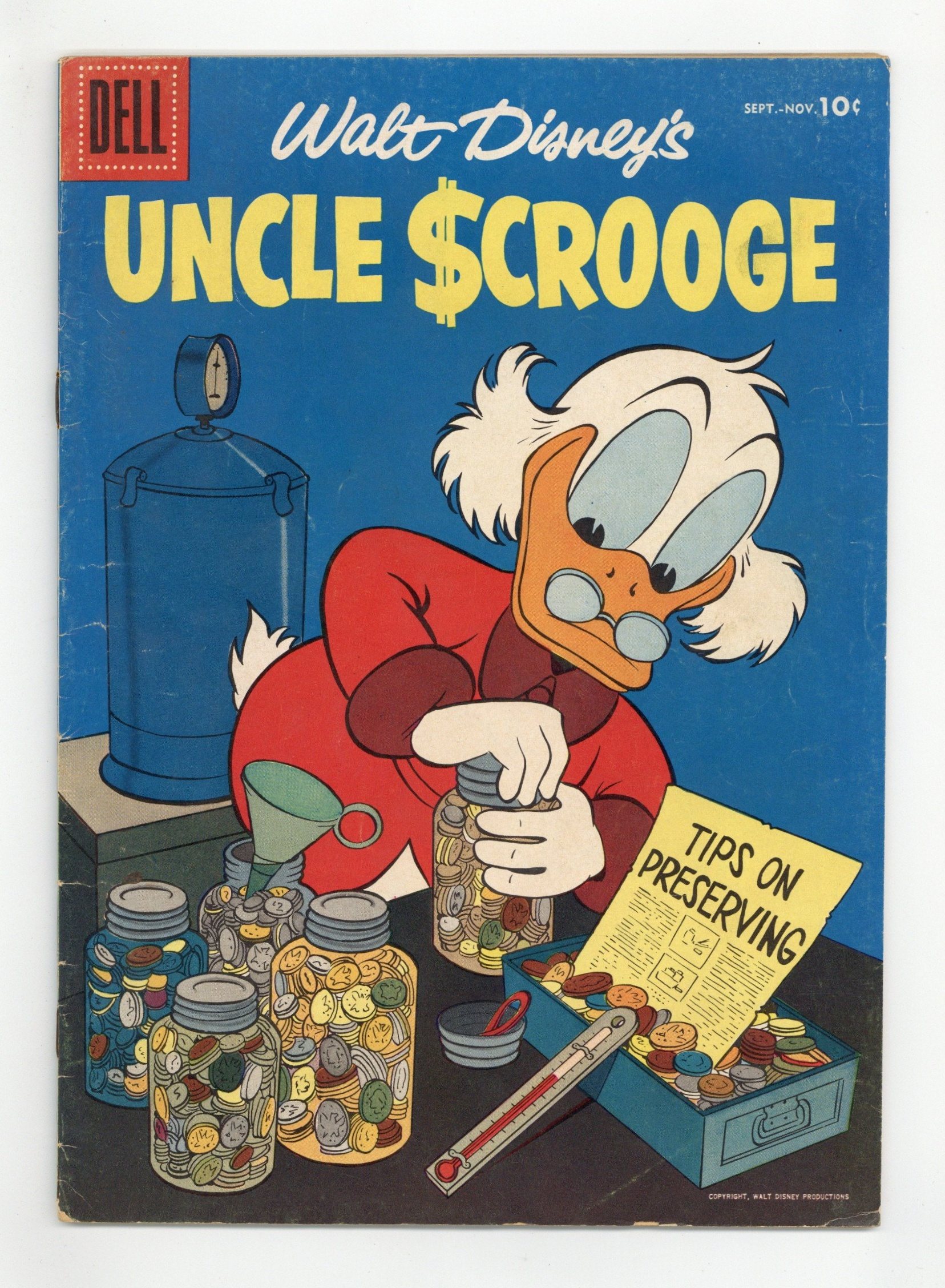 First issue with advertisement, a full page on the back cover. Otherwise entire issue from cover to cover is comic stories and one page strips. Uncle Scrooge in "The Second Richest Duck" in which Scrooge engages in a battle with rival Flintheart Glomgold over who is the richest duck. Issue also has Scrooge in an untitled story, Gyro Gearloose in an untitled story and a one-page text feature "The Dilapidated Dinosaur." Stories by Carl Barks. 36 pages, full color. Cover price $0.10.