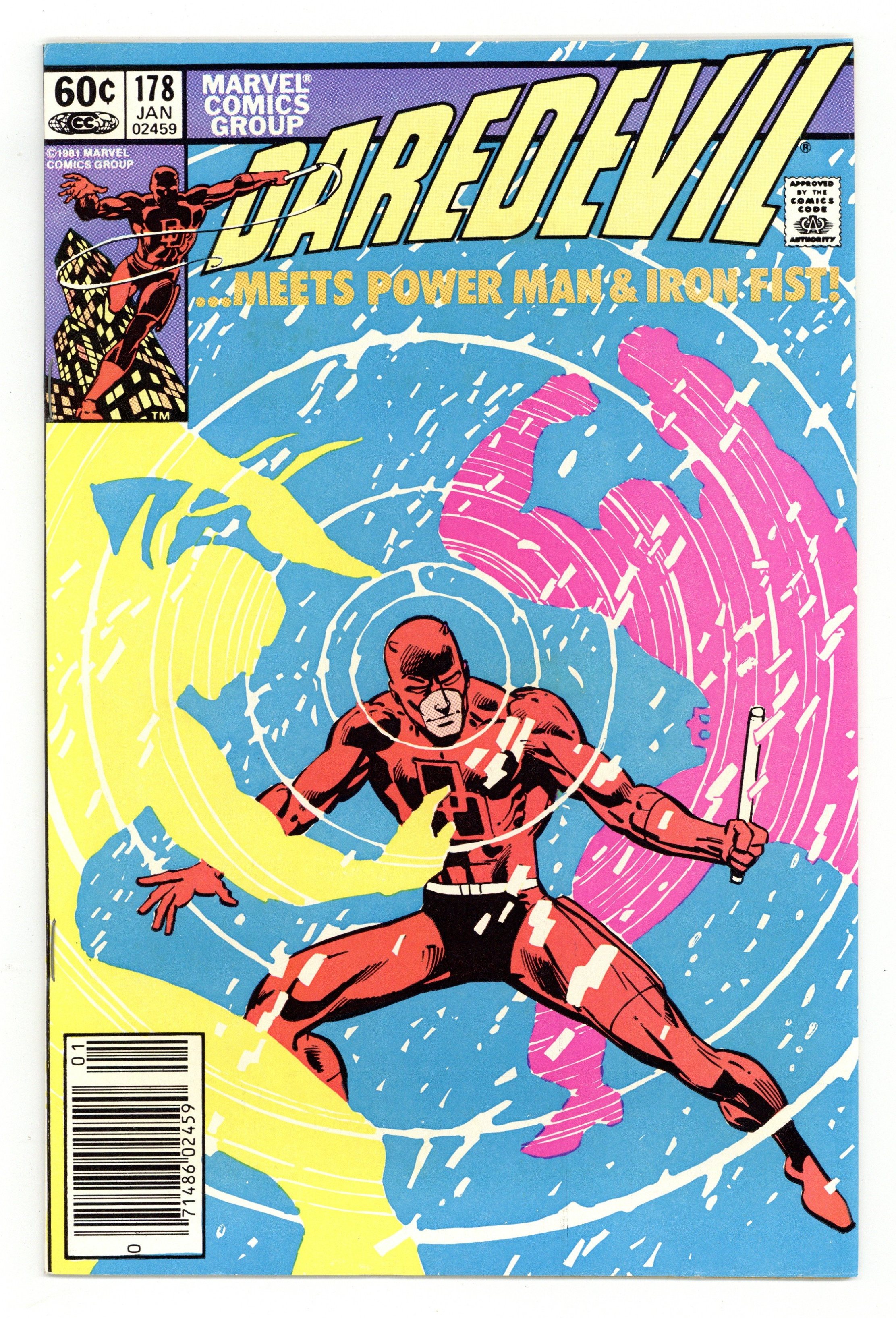 $9.00Newsstand Edition. "Paper Chase" Written by Frank Miller. Pencils by Frank Miller (breakdowns) and Klaus Janson (finished art), inks by Klaus Janson. Cover pencils by Frank Miller with inks by Klaus Janson. Foggy hires Power Man and Iron Fist to help protect the stooge who is going to help Nelson and Murdock link Mayoral candidate Cherryh to the Kingpin. Kingpin talks to Elektra about employment opportunities. Appearance by J. Jonah Jameson. Notes: Story continued in Power Man and Iron Fist #77. Promo Pin-Up for Power Man and Iron Fist #77 with art by Denys Cowan. First 60-cent issue. Cover price $0.60.