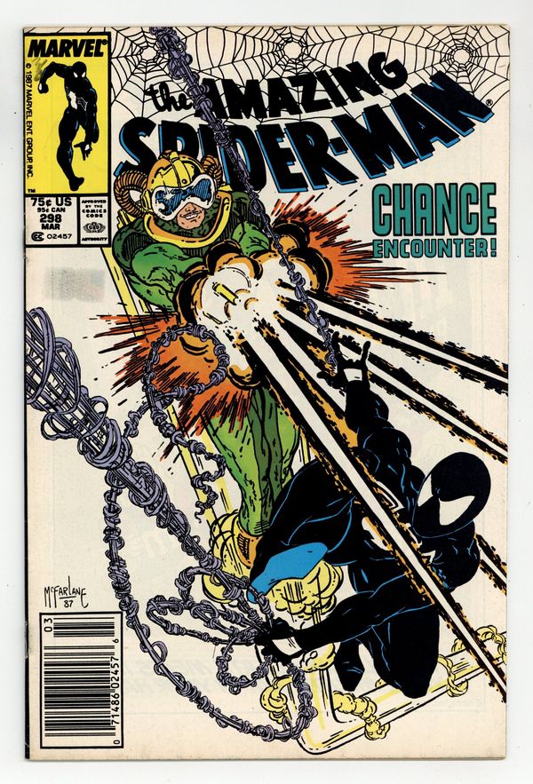Tags: Spider-Man$99.00Newsstand Edition. "Chance Encounter!" Part 1 of 2. Script by David Michelinie. Pencils by Todd McFarlane. Inks by Bob McLeod. Cover by Todd McFarlane. Chance is back in business and working a new job for the Life Foundation! The clandestine organization wants Chance to steal an arms shipment coming into the west side docks! That should be a piece of cake for the high-flying mercenary! However, the Daily Bugle dispatches an undercover photographer to observe the delivery! And beneath the moonlit sky, fireworks explode when Chance and the Amazing Spider-Man throw down on the docks! First appearance (and cameo on the last page) by Eddie Brock (aka Venom). First appearance of Carlton Drake of the Life Foundation. Cameo appearances by Mary Jane Watson, Joy Mercado, and Joe Robertson. (Notes: Chance previously appeared in Web of Spider-Man 15. This issue begins Todd McFarlane's 2-year run as the penciler of the Amazing Spider-Man series.) 36 pages. Cover price $0.75.
