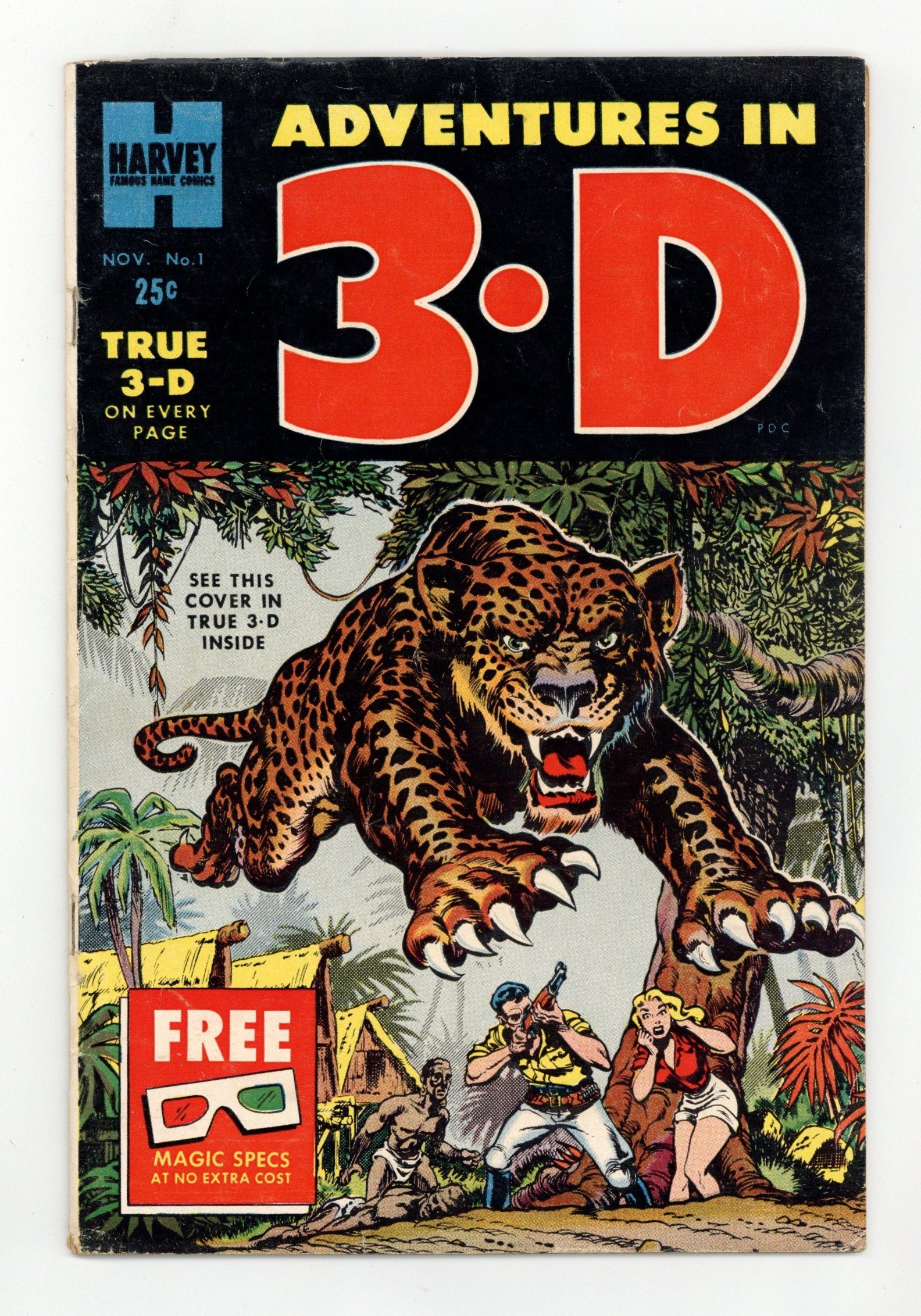Cover by Howard Nostrand. Stories and art by Bob Powell and Howard Nostrand. A series of 3-D adventure stories, published to coincide with the 3-D craze in movies and comics of the era. The stories include a space-opera, a tale of explorers battling the dangers of the jungle, and a quest to discover the strange mountain creature known as the Snowman. Plus a story that takes advantage of the 3-D technology of the era by telling two separate tales on the same page. Breaking the Time Barrier!; Jungle Drum; Three-D Blinkey; The Hidden Depths; The Snowman; Sand. 36 pages, B&W with 3-D effects. NOTE: Originally distributed with 3-D glasses; may or may not still have them included. Cover price $0.25.