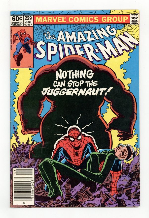 Newsstand Edition. Nothing Can Stop the Juggernaut!" Part 1 of 2. Script by Roger Stern. Art by John Romita Jr. (breakdowns) and Jim Mooney (finishes). Cover by John Romita Jr. and Al Milgrom. One of the classic Spider-Man stories of the bronze age! Black Tom Cassidy is tired of losing to the X-Men and thinks that having Madame Webs powers on his side would reverse his fortune! So he sends his indestructible friend to grab her! But Madame Web foresees the danger and calls her wall-crawling friend to save her! And in the middle of Manhattan, the Amazing Spider-Man meets the Juggernaut...for the life of Madame Web! This may become one of the web-slingers greatest victories...or one of his bitterest defeats. A two-part masterpiece! Cameo appearances by Wong, J. Jonah Jameson, Joe Robertson, and Betty Brant Leeds. (Notes: The Juggernaut previously appeared in Spider-Woman 38. Betty Brant was last seen in Amazing Spider-Man 197. This story was reprinted in 1989 in the trade paperback: The Sensational Spider-Man -- Nothing Can Stop the Juggernaut; and also in Spider-Man Magazine 3.) 36 pgs. Cover price $0.60.