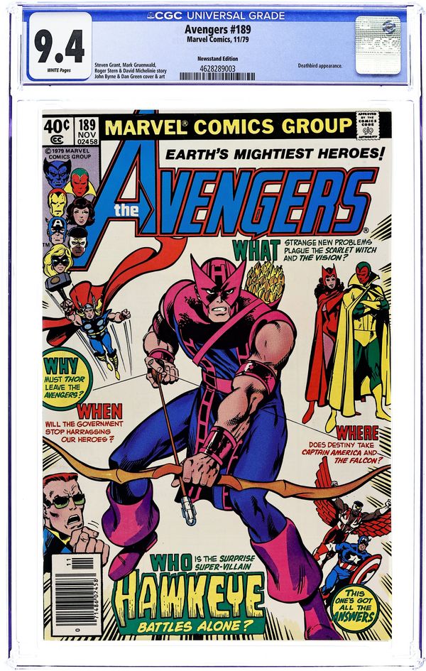 Newsstand Edition. "Wings and Arrows!" Plot by Steven Grant, Mark Gruenwald and Roger Stern. Script by Steven Grant. Pencils by John Byrne. Inks by Dan Green. Cover by John Byrne and Terry Austin. The Avengers' titanic tussle with Arsenal (in Avengers Annual 9) is over. And now the team is getting back to normal and re-establishing the government-mandated seven person roster. But Clint Barton is not on that roster, so the Avengers' former ace archer must find another job. Hawkeye receives a nice lead from Jarvis and lands a security position with Cross Enterprises! However trouble isn't too far behind, and just a few days later Hawkeye gets to strut his stuff vs. the Shi'ar warrior...Deathbird! Cameo appearances by Peter Gyrich and Jocasta. (Notes: Deathbird appears next in Uncanny X-Men 155.) 36 pages Cover price $0.40.