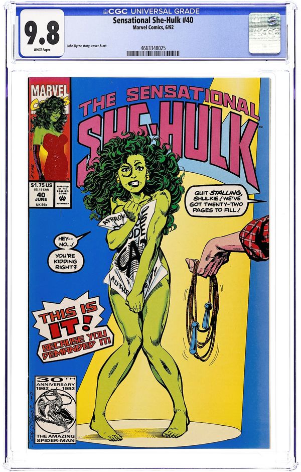 Direct Edition. Cover art by John Byrne. Untitled She-Hulk story starring Wyatt Wingfoot, Weezi Mason, Al the Alien, U.S. Archer [Ulysses Solomon Archer], and Spragg, script and art by John Byrne; Using a recall transponder in She-Hulk's car, Al the Alien and U.S. Archer transport She-Hulk and Weezi to the Star Stop Cafe to help stop Spragg, the Living Hill. 36 pages, full color. Cover price $1.75.