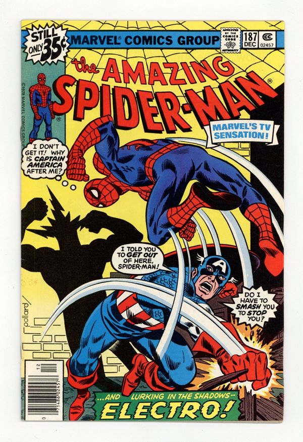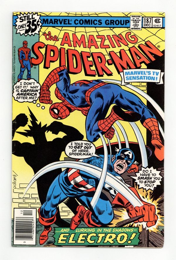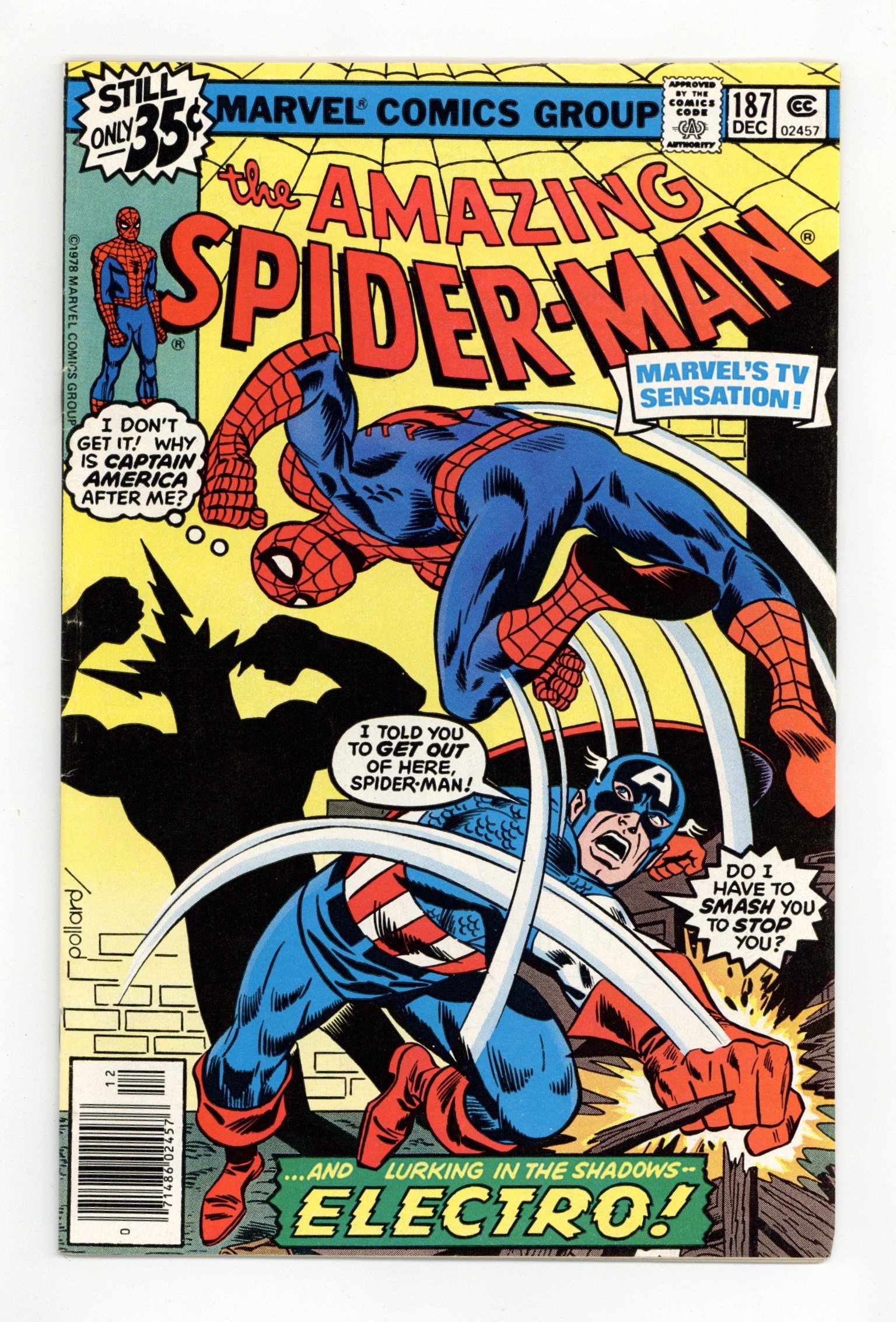 Tags: Marvel Legacy Numbering: Amazing Spider-Man (part 187), Spider-Man$30.00"The Power of Electro!" Guest-starring Captain America. Plot by Marv Wolfman and Jim Starlin. Script by Marv Wolfman. Brilliant art by Jim Starlin (layouts) and Bob McLeod (finishes). Cover by Keith Pollard. It's an overstuffed tale featuring the star-spangled avenger, web-slinger, SHIELD, Electro, and the bubonic plague! When the Daily Bugle receives a tip that authorities have cordoned off the neighborhoods surrounding the Indian Point Power Station, Jonah sends his ace photographer to investigate! The web-slinger easily slips past the SHIELD agents but runs into a problem after bumping into the Sentinel of Liberty! Cap wants the wall-crawler to leave the area ASAP! But Cap would think differently if he knew that an electrifying encounter awaits! The Amazing Spider-Man and Captain America vs. Electro! Cameo appearances by Dum Dum Dugan, J. Jonah Jameson, and Joe Robertson. (Notes: This is one of only three issues Jim Starlin drew for the Amazing Spider-Man title (1st series): issues 113, 114, and 187. More of Jim Starlin's artwork featuring Spider-Man can be seen in Marvel Two-in-One Annual 2. The web-slinger and Electro previously battled in Marvel Team-Up 56.) 36 pages Cover price $0.35.
