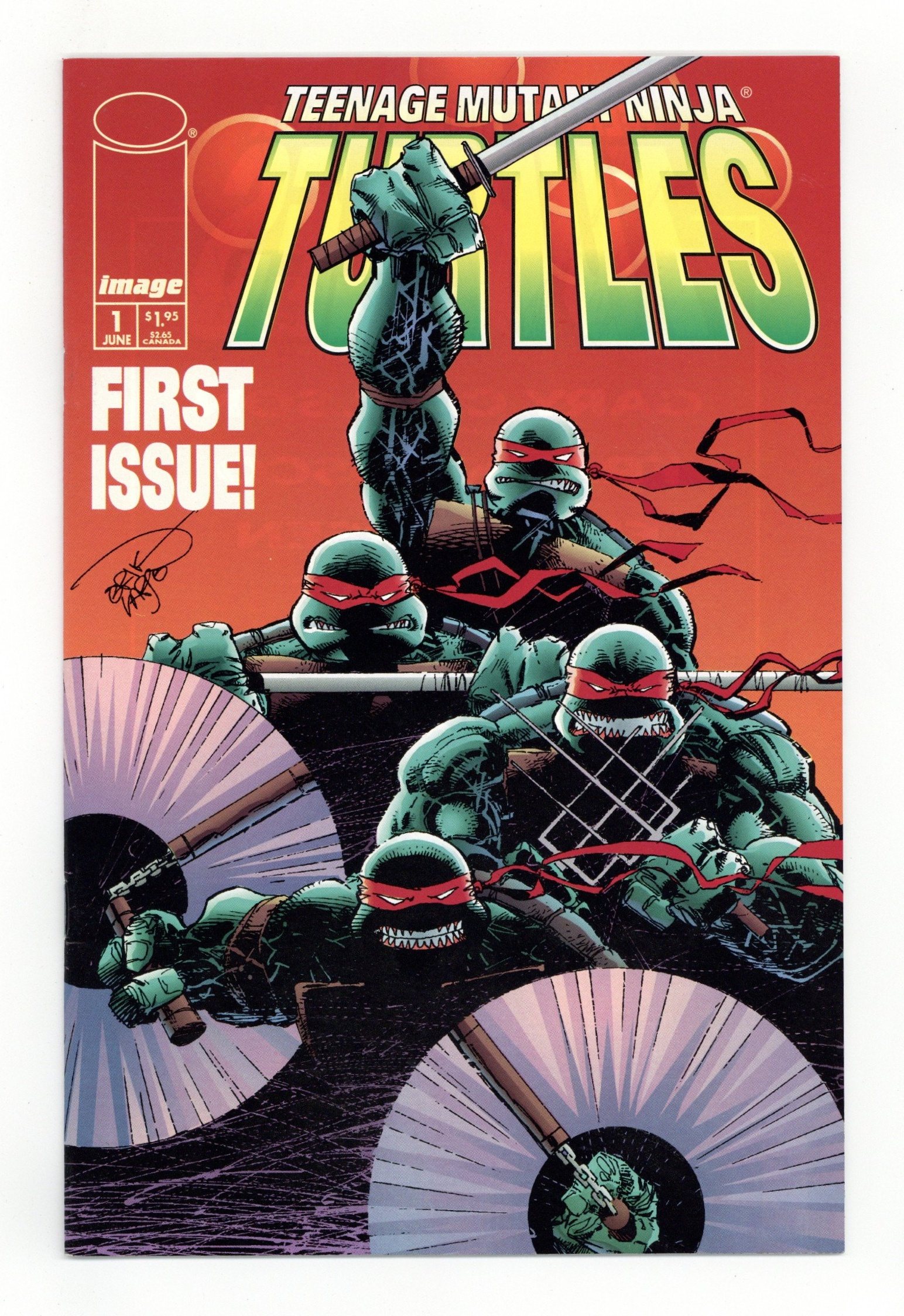 Mike, Raph, Don and Leo receive a rude welcome to the Image Universe when their sewer home is invaded by trigger-happy goons of the mysterious Warlord Komodo! Fandom's favorite rugged reptiles return to their black & white roots as bullets fly, blood flows and heads roll! These ain't the cartoons-for-kiddies Turtles. These are the hard-edged, fighting mad ninjas that took the comic world by storm--the ones you demanded! Written by Gary Carlson. Art by Frank Fosco and Erik Larsen. #1A cover by Erik Larsen. B/W 24 pg. Cover price $1.95.