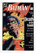 First printing. Direct Edition. Cover art by Mike Mignola. "A Death in the Family" part 3 of 4, script by Jim Starlin, pencils by Jim Aparo, inks by Mike DeCarlo; Death of Sheila Haywood; Burial of Sheila Haywood and Jason Todd; The Joker becomes the Iranian Ambassador to the U.N. Results of Phone Poll as to whether Robin dies this issue or not. NOTE: Most issues from 397-432 were reprinted in 1989 and sold in multipacks. These 2nd and 3rd prints have back cover ads dated 1989. 36 Pages, Full Color. Cover price $0.75.