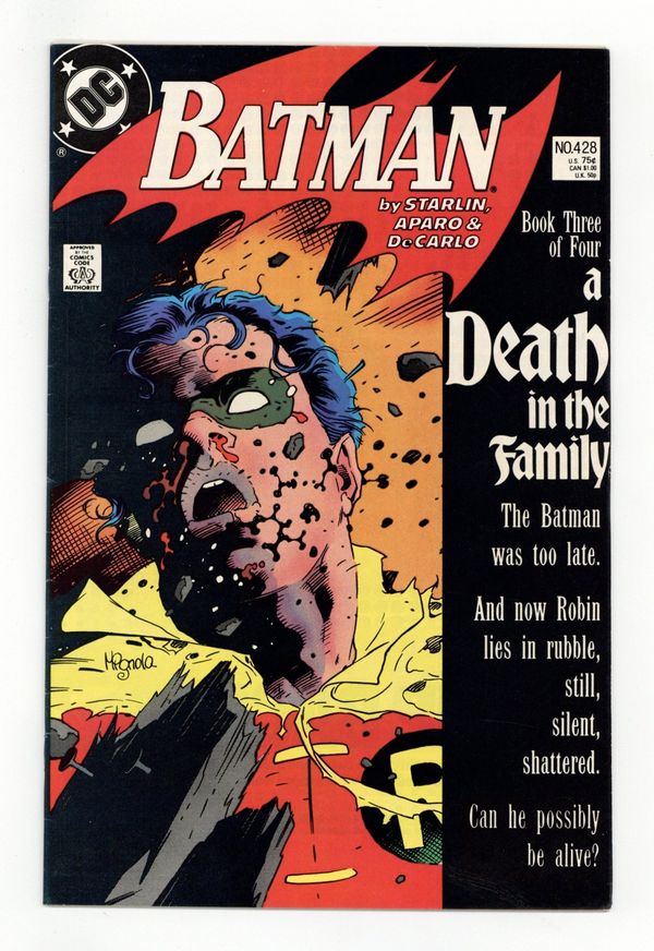 $20.50First printing. Direct Edition. Cover art by Mike Mignola. "A Death in the Family" part 3 of 4, script by Jim Starlin, pencils by Jim Aparo, inks by Mike DeCarlo; Death of Sheila Haywood; Burial of Sheila Haywood and Jason Todd; The Joker becomes the Iranian Ambassador to the U.N. Results of Phone Poll as to whether Robin dies this issue or not. NOTE: Most issues from 397-432 were reprinted in 1989 and sold in multipacks. These 2nd and 3rd prints have back cover ads dated 1989. 36 Pages, Full Color. Cover price $0.75.