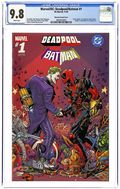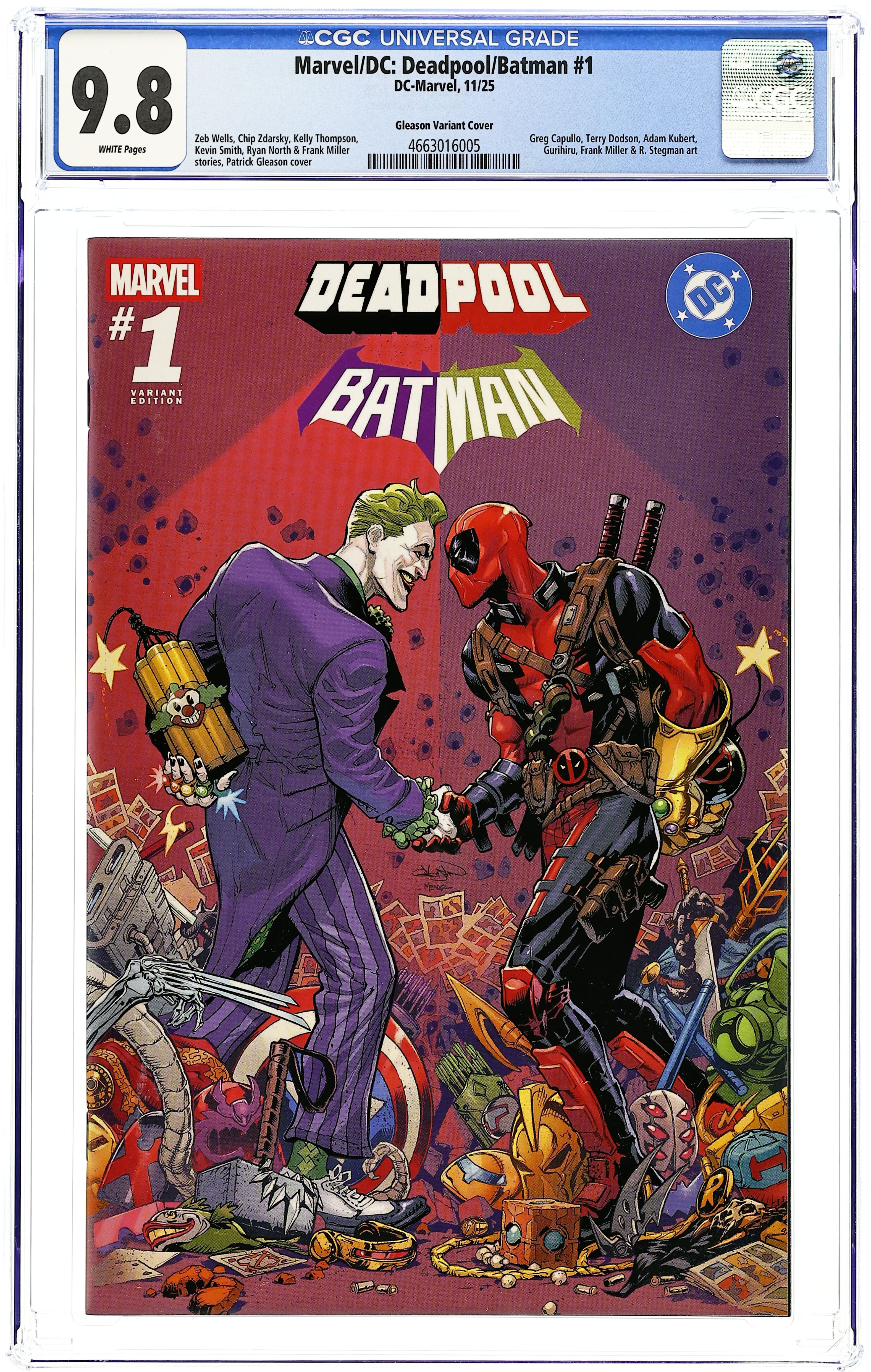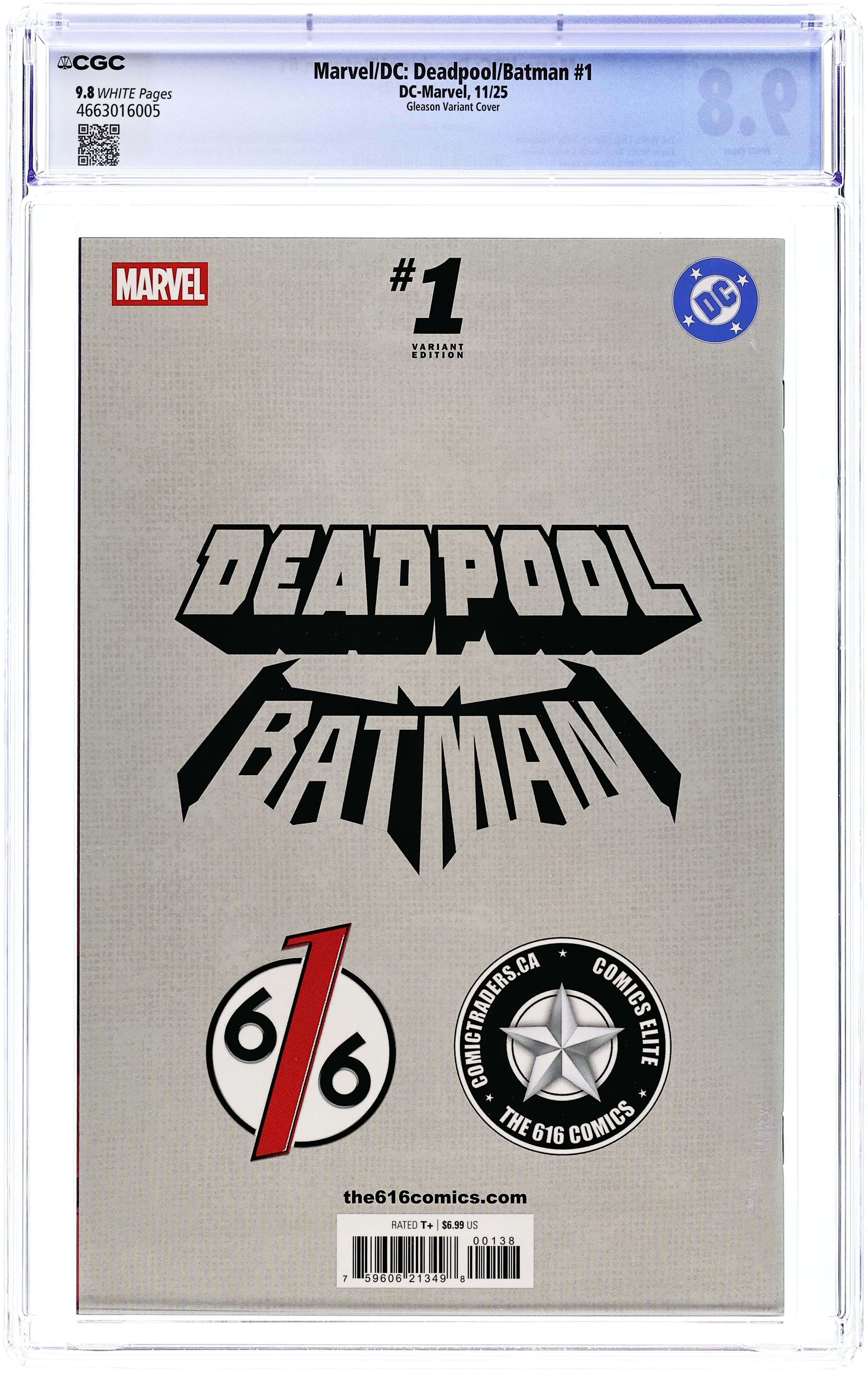 The 616 Comics, Comic Traders, and Comics Elite Exclusive Variant Cover by Patrick Gleason. Written by Zeb Wells, Chip Zdarsky, Kelly Thompson, Kevin Smith, Al Ewing, Frank Miller, Ryan North. Art by Greg Capullo, Terry Dodson, Gurihiru, Adam Kubert, Dike Ruan, Frank Miller, Ryan Stegman. The crossover you've pined for but never thought possible: DEADPOOL and BATMAN cross swords and batarangs as MARVEL and DC unite for the first time in decades! WADE WILSON has been hired for a job in GOTHAM CITY, but will the WORLD'S GREATEST DETECTIVE help him or destroy him? The one-shot will also feature additional backup stories spotlighting other exciting Marvel and DC team-ups from a lineup of all-star talent, including Daredevil and GREEN ARROW by Kevin Smith and Adam Kubert, Captain America and Wonder Woman by Chip Zdarsky and Terry Dodson, and Jeff the Land Shark and Krypto by Kelly Thompson and Gurihiru. 64 pages, full color, Rated T+ Cover price $6.99.