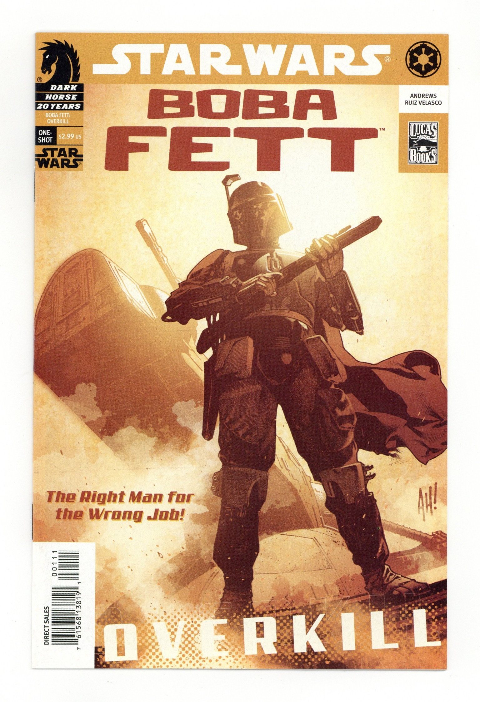 Boba Fett rockets onto the scene with blasters blazing in this stand-alone story featuring the galaxy's greatest bounty hunter taking on a dangerous contract that proves deadly for all involved! Summoned to settle the score between two warring factions, Fett quickly shows his employers the importance of always choosing the right tool for the job, and the folly of underestimating just how much damage and chaos a single Mandalorian can inflict. Once unleashed, Fett's drive to finish the job is unshakable, and both groups quickly realize they're dealing with a bigger and much deadlier mutual problem-one that must be stopped before it obliterates everything! Don't miss this essential piece of the Boba Fett mythos written by Thomas Andrews (Star Wars Empire) and illustrated with the eye-popping art of Francisco Ruiz Velasco (Lone Wolf 2100). Cover price $2.99.